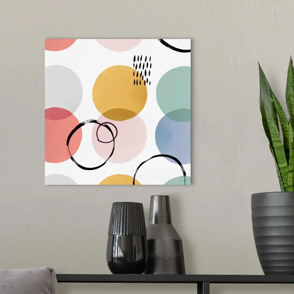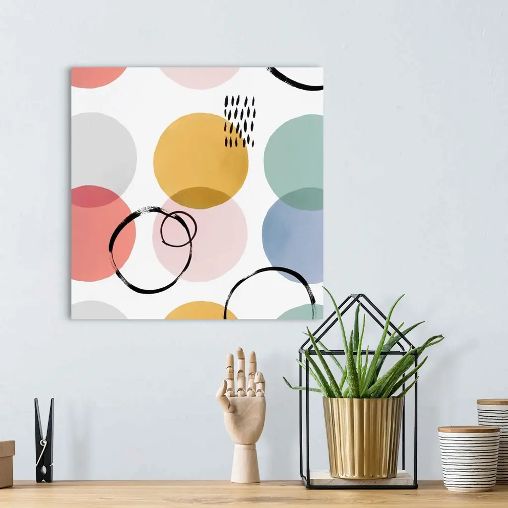 Square modern design of varies circles in pastel colors and overlapping rings.