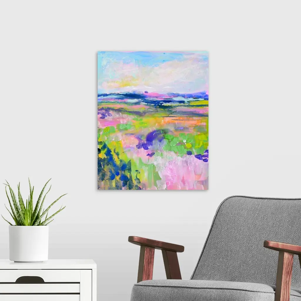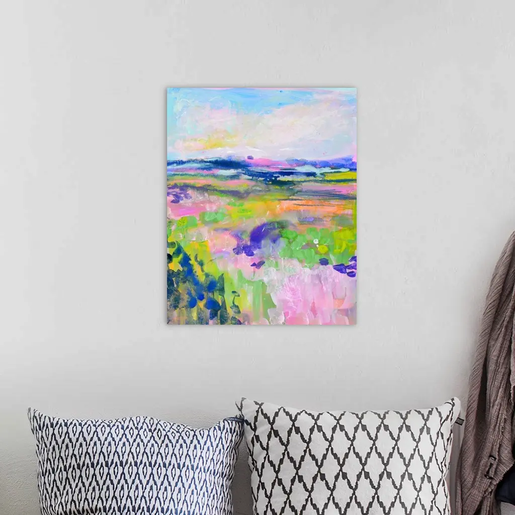 Brightly colored landscape with a field of vivid green and pink under a pastel blue and pink sky.