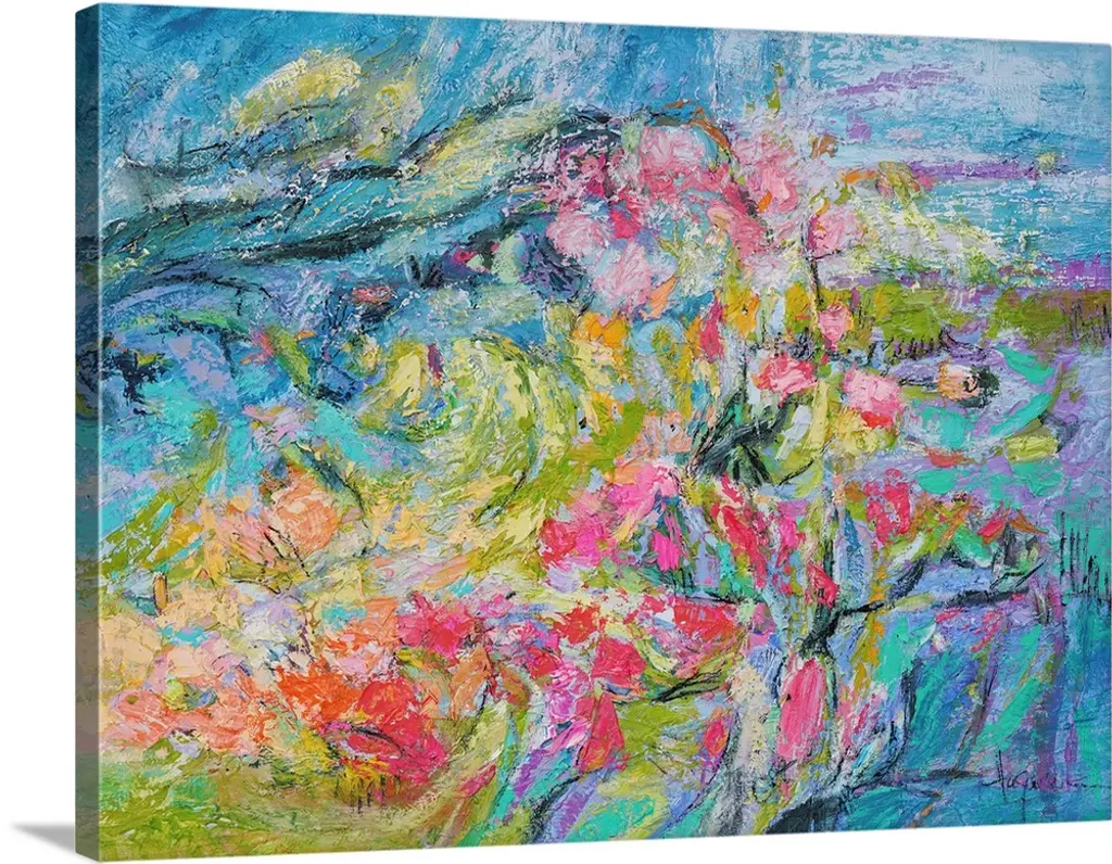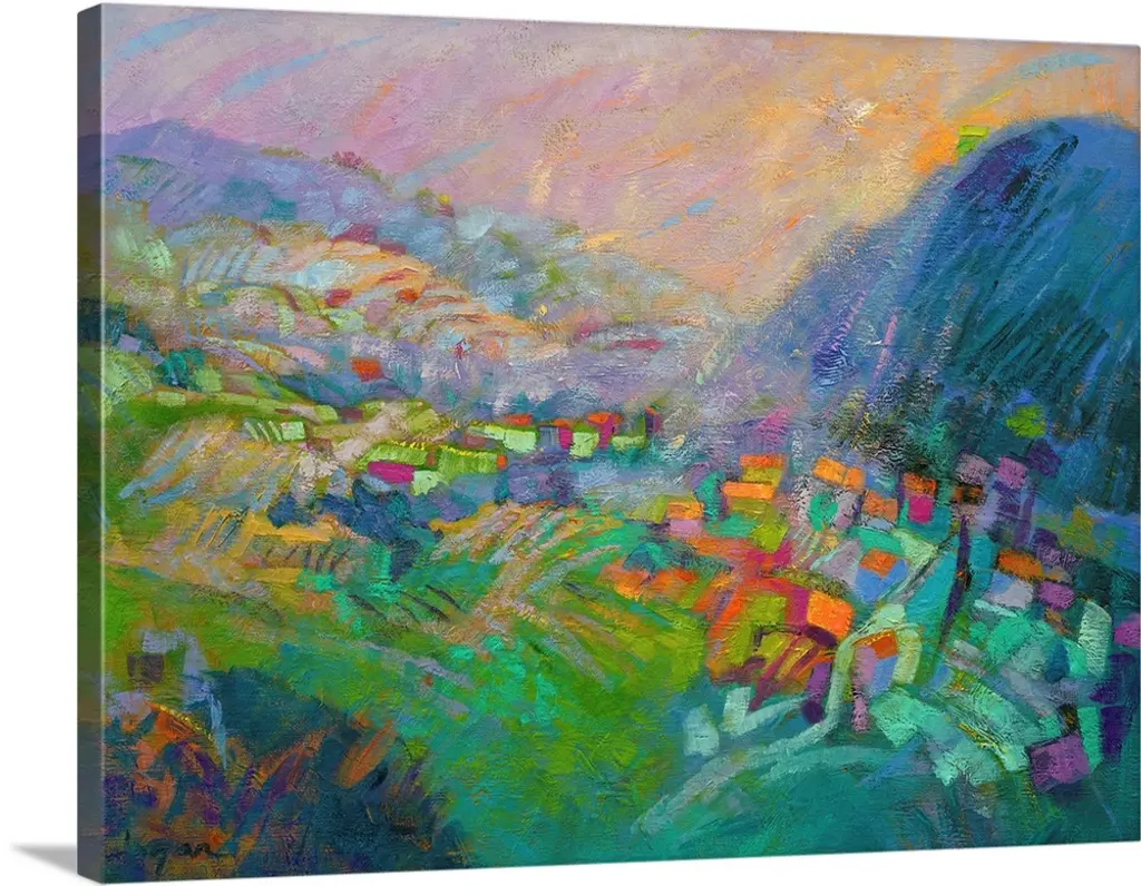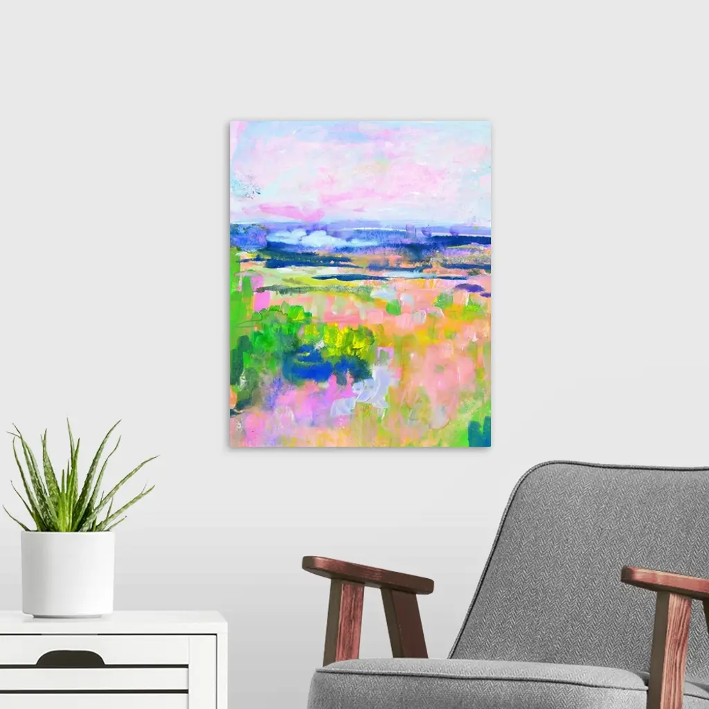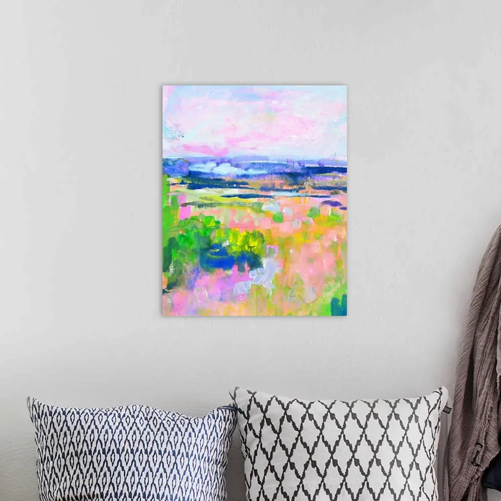 Brightly colored landscape with a field of vivid green and pink under a pastel blue and pink sky.