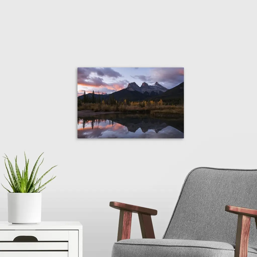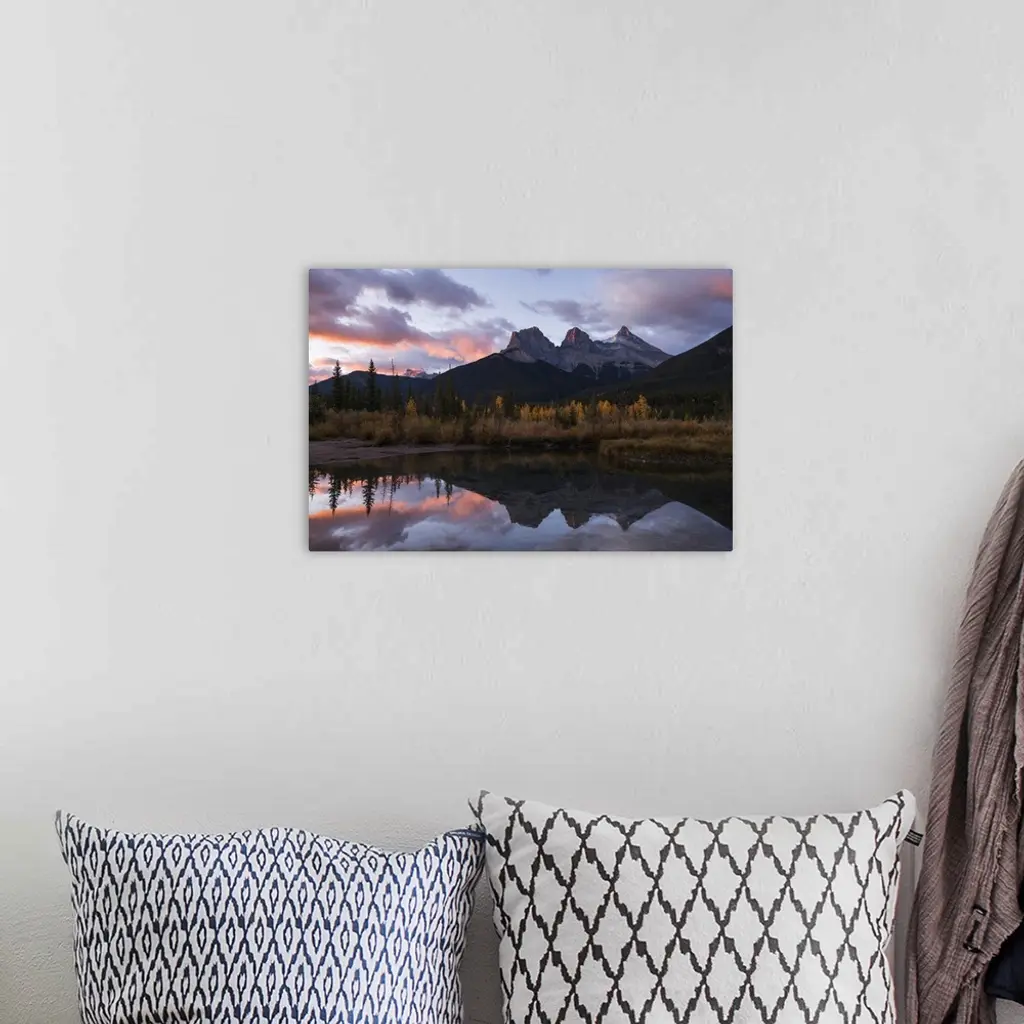 Colourful sunrise over Three Sisters at Policeman Creek in autumn, Canmore, Banff, Alberta, Canadian Rockies, Canada, North America