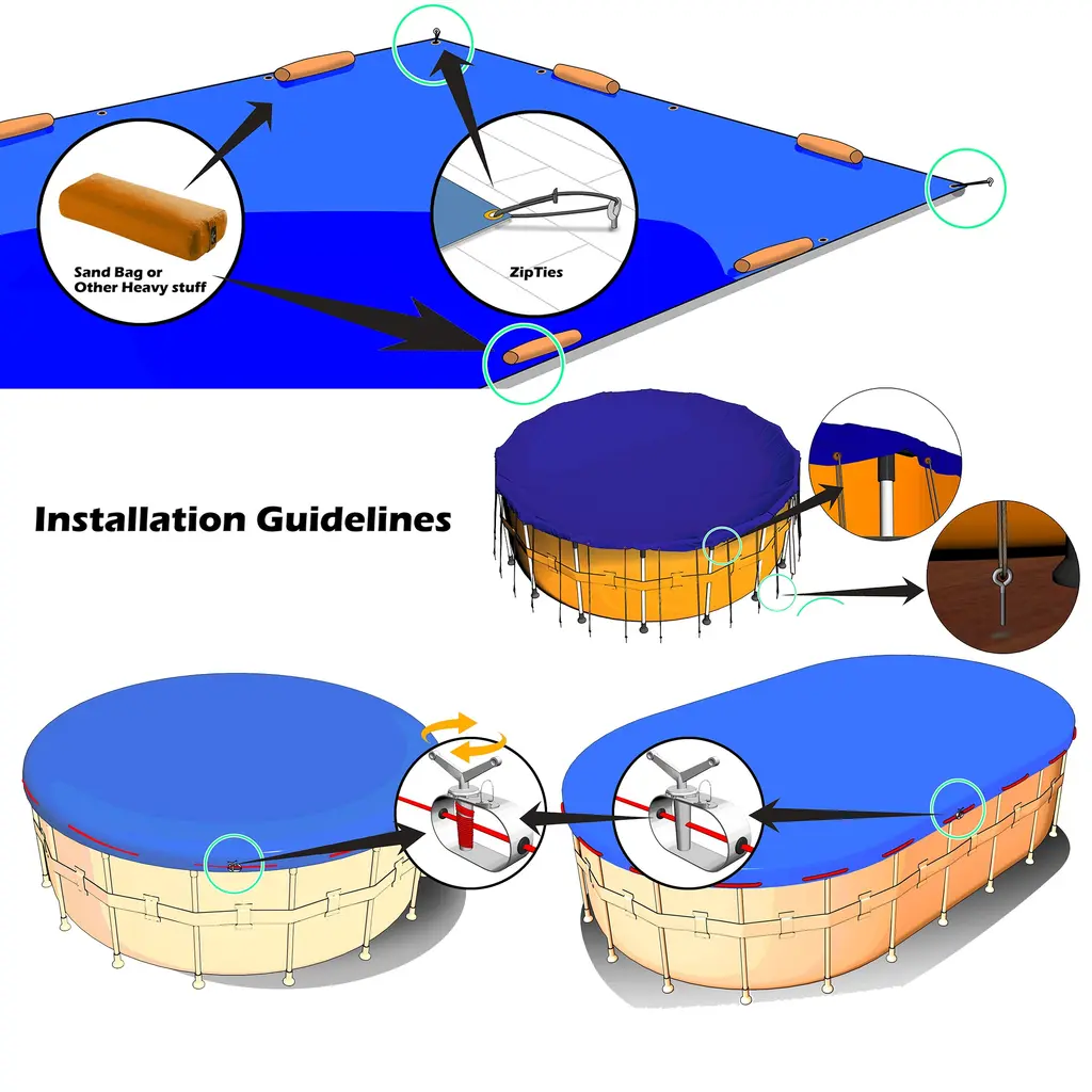 ColourTreeUSA Subzero Winter Pool Covers are a great solution for keeping your pool in tip-top shape throughout winter and into the spring season. The thick woven polyethylene is constructed with double-stitched perimeter which allows it to withstand some of the toughest winter weather conditions and also keeps debris and rainfall out of your pool. The pool cover also has a black underside which helps stifles algae growth and keeps your pool clean for spring and summer. Installing and securing the cover is a breeze with grommets every 4 ft. around the perimeter and includes 1x steel cable and 1x ratchet winch to keep the pool cover snug and fit. Please see below for pool size and cover size specifications (4 ft. overlap).