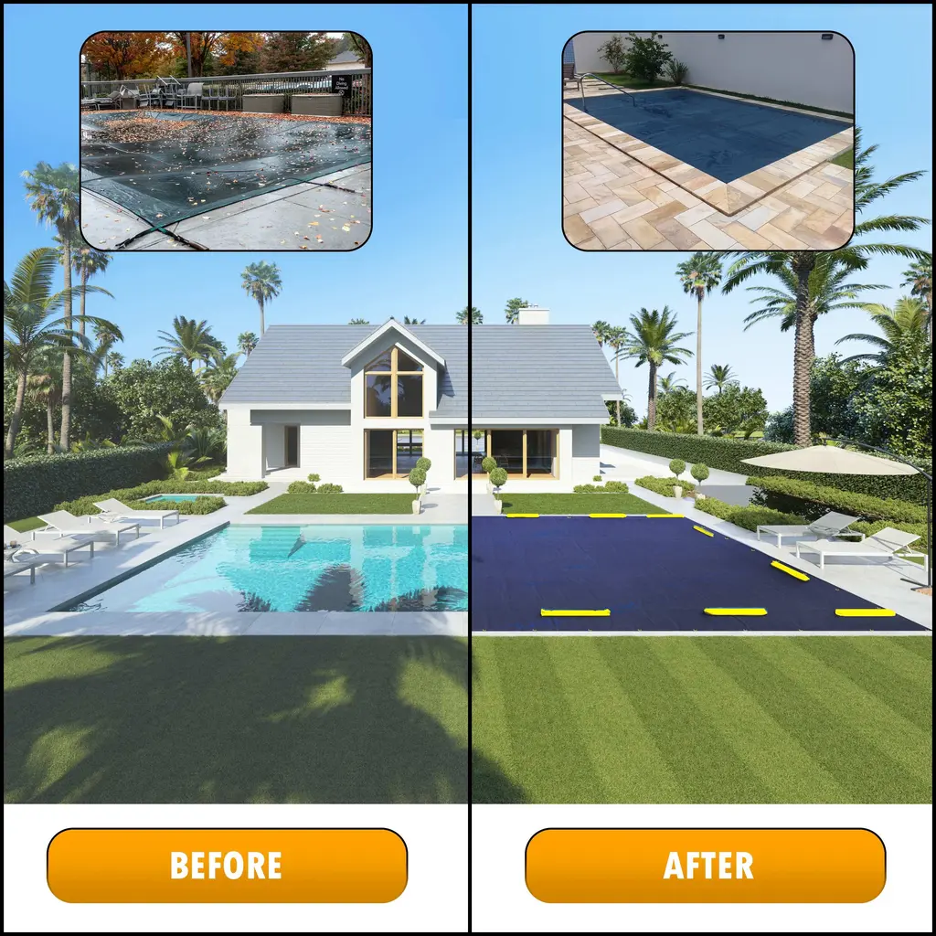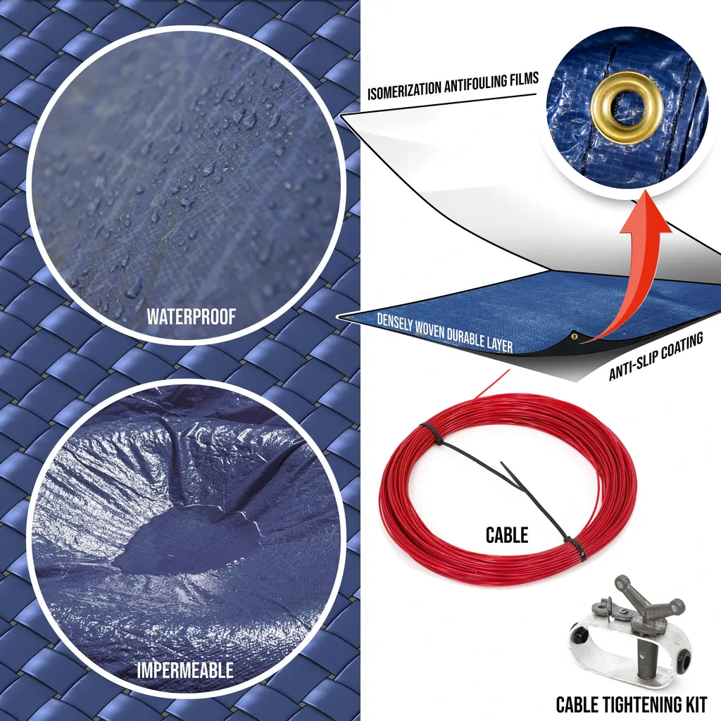 ColourTreeUSA Subzero Winter Pool Covers are a great solution for keeping your pool in tip-top shape throughout winter and into the spring season. The thick woven polyethylene is constructed with double-stitched perimeter which allows it to withstand some of the toughest winter weather conditions and also keeps debris and rainfall out of your pool. The pool cover also has a black underside which helps stifles algae growth and keeps your pool clean for spring and summer. Installing and securing the cover is a breeze with grommets every 4 ft. around the perimeter and includes 1x steel cable and 1x ratchet winch to keep the pool cover snug and fit. Please see below for pool size and cover size specifications (4 ft. overlap).