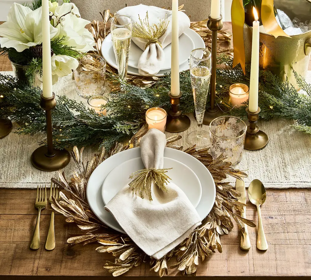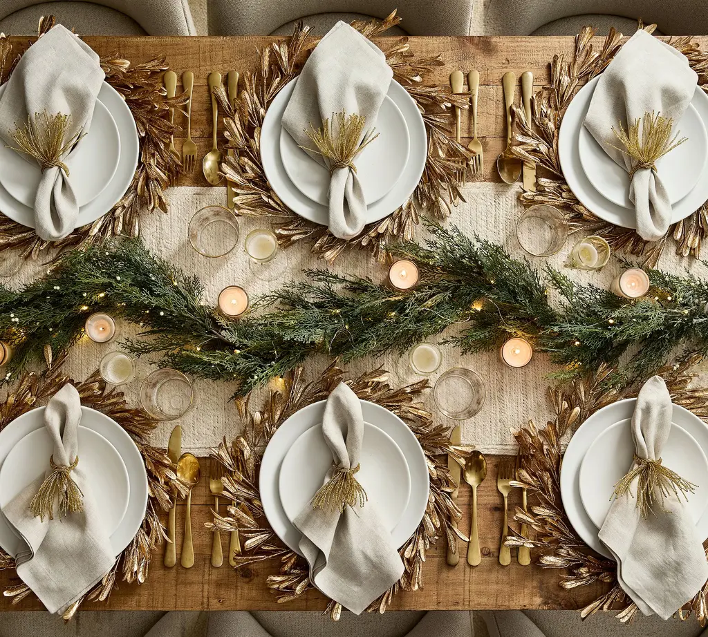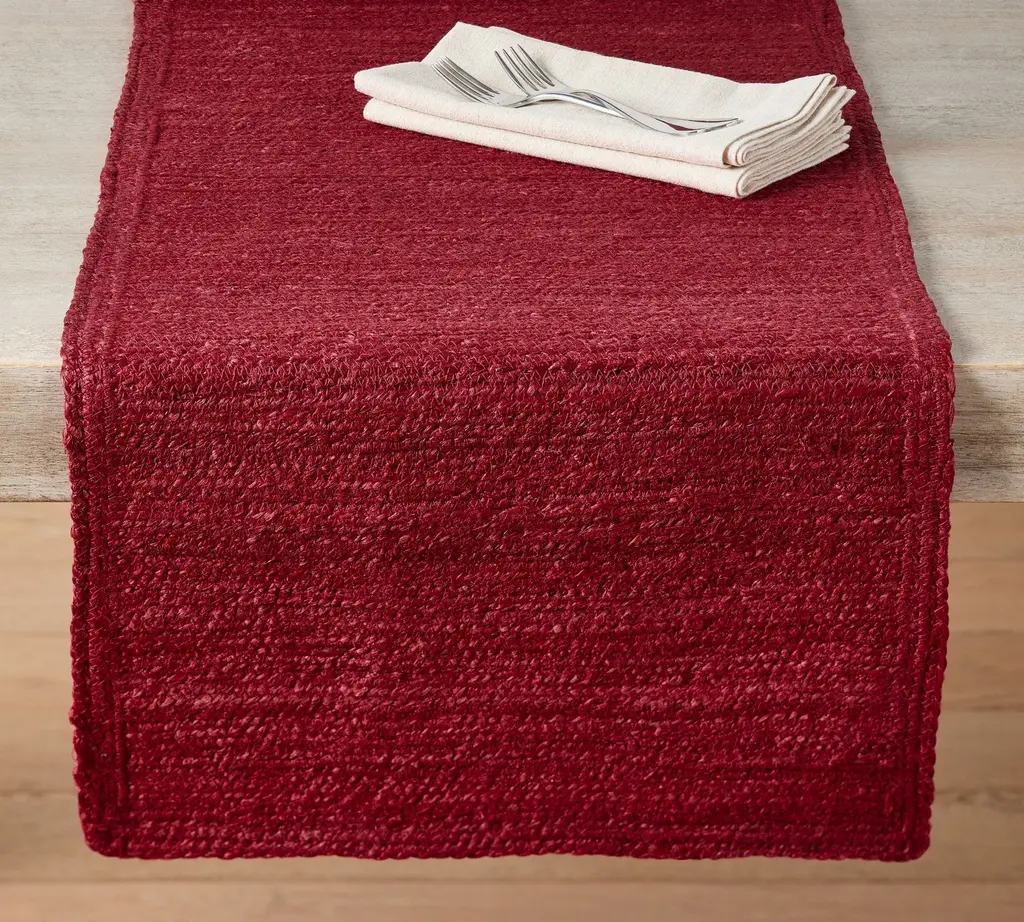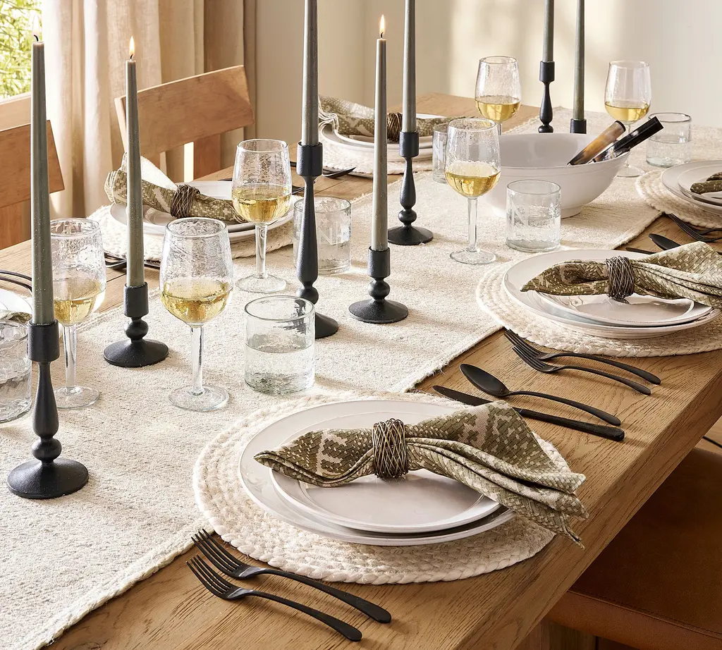 Dial up the texture. Paired with the dimpled drape of a linen tablecloth and napkins (we like a mix of two colors), this woven runner is a quick makeover for everyday neutral stoneware. Brunch-ready, guest-ready.
