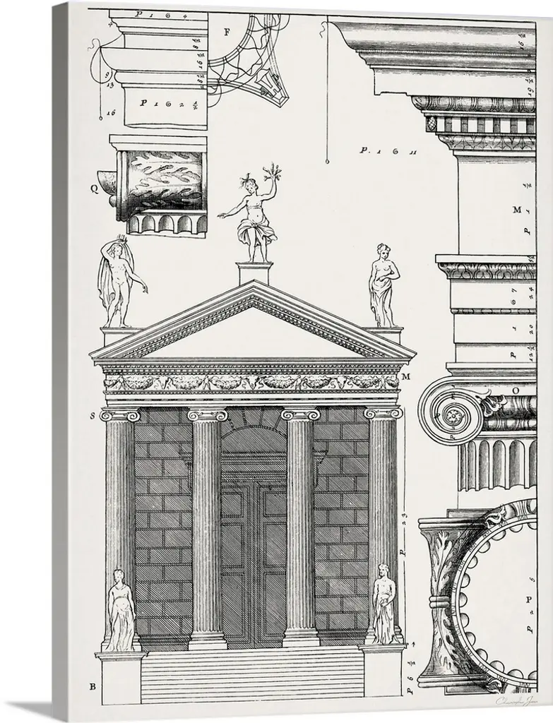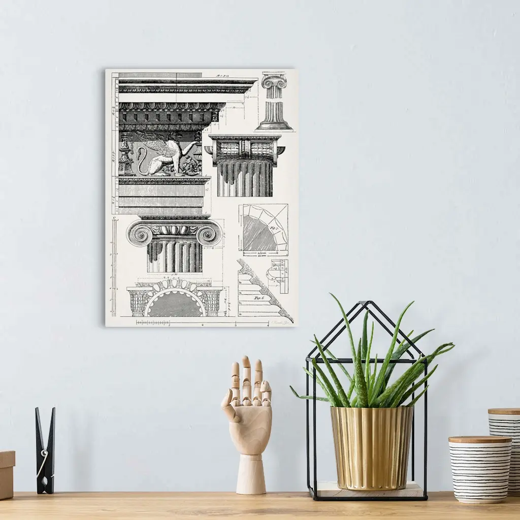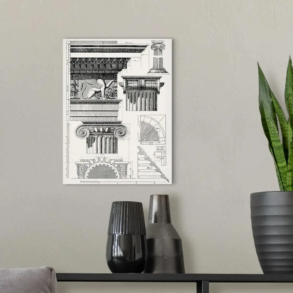 Black and white architectural illustration and blueprint of detailed columns with numbered measurements in the background.