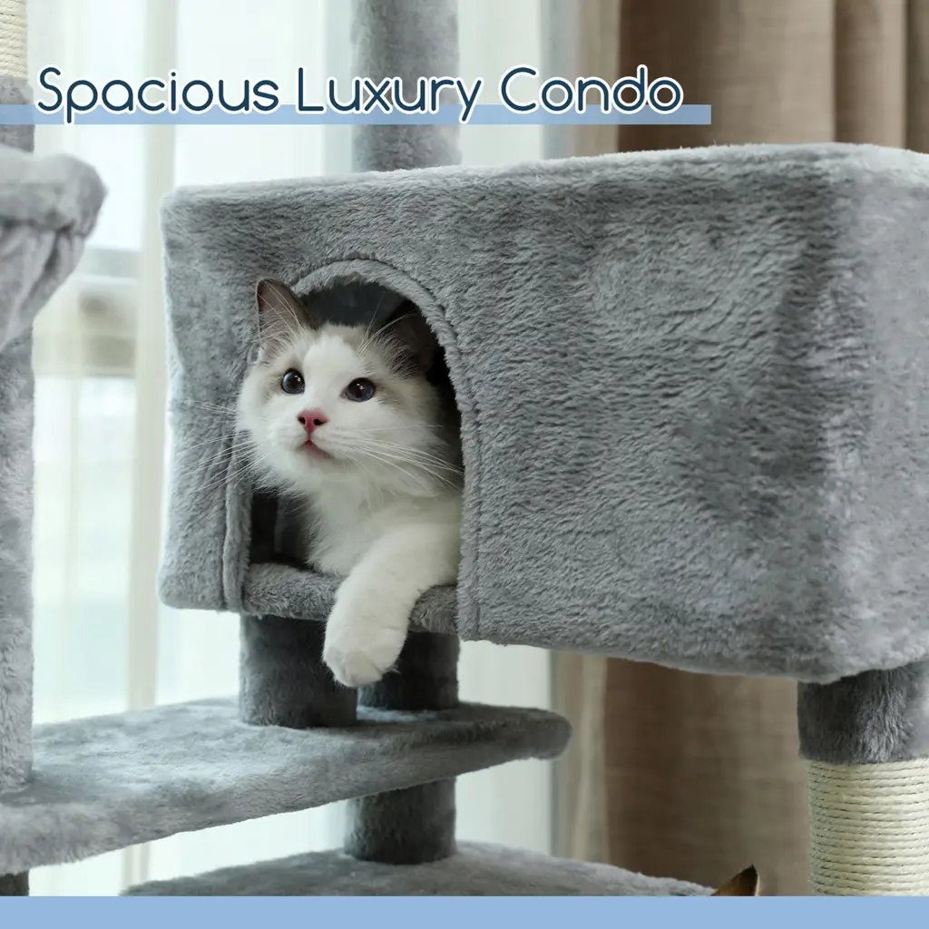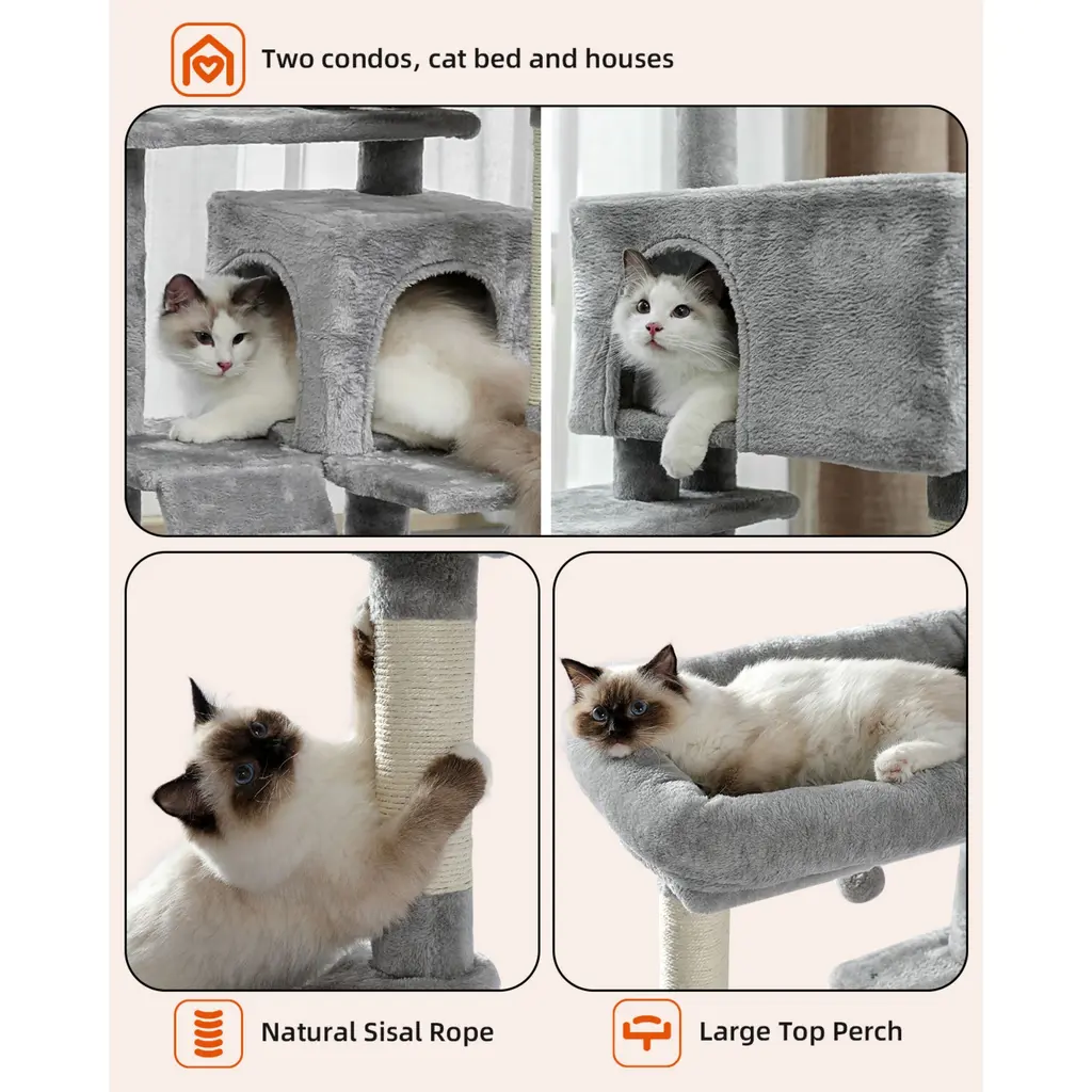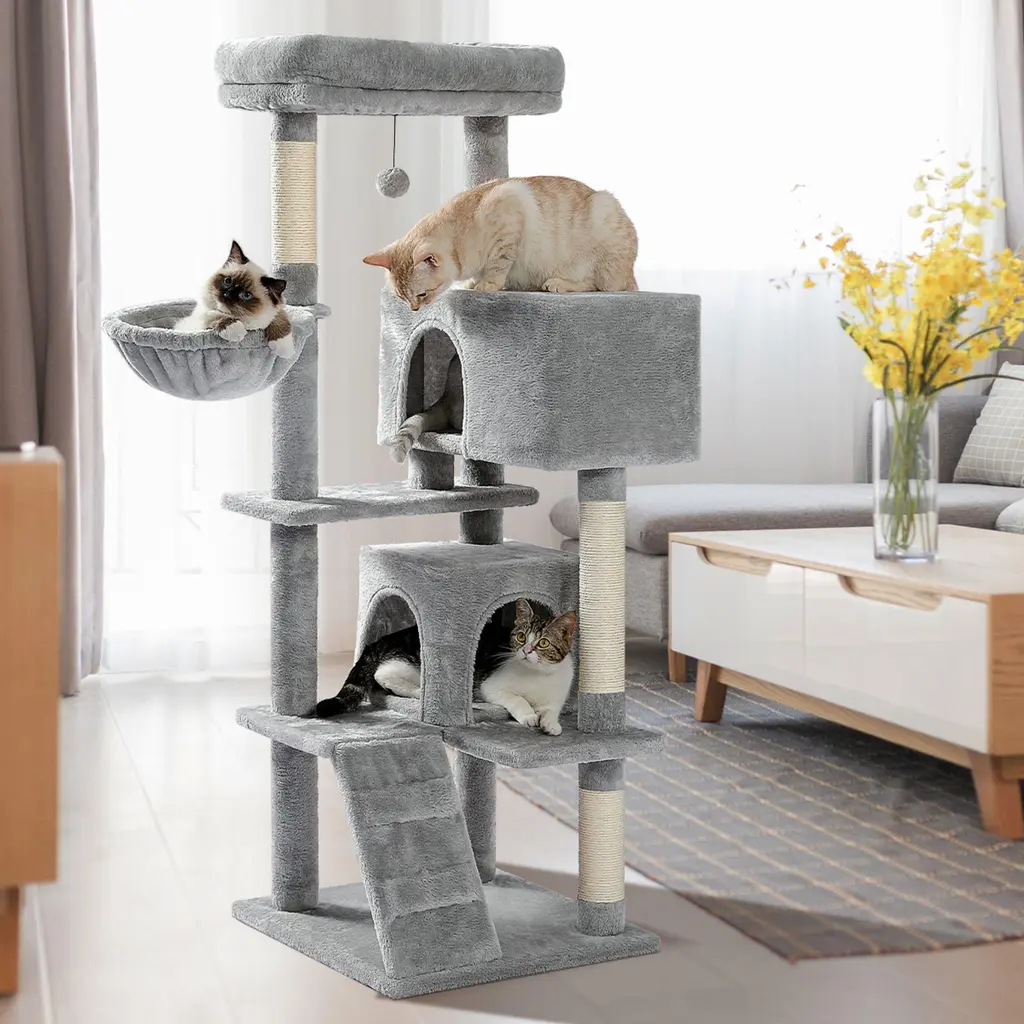 Introducing our premium cat tree designed specifically for large and adult cats. With its spacious dimensions and a towering height of 56 inches, this cat tower is perfect for your furry friends. It features an extra-large top perch, a plush hammock, a cozy cat condo, and a dangling plush ball for endless entertainment. The cat tree can accommodate up to three large cats, providing them with multiple resting spots and a variety of activities to enjoy. Sturdy and Durable Construction:Stylish and Functional Design:Quality Assurance:Customer Support:Conclusion: