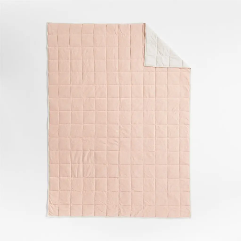 Softer than their favorite tee, cooler than the average cotton bedding and yarn-dyed for long-lasting color, our Cotton Jersey Quilt just changed the bedding game. And by choosing organic cotton, you're helping create a better future for your kids: Compared to conventional cotton, it can reduce CO2 by 46%, energy consumption by 62% and irrigated water consumption by 90%. Cozy heathered light pink reverses to white for a sweet neutral layer that kiddos can mix and match with the rest of our Cotton Jersey Bedding Collection.