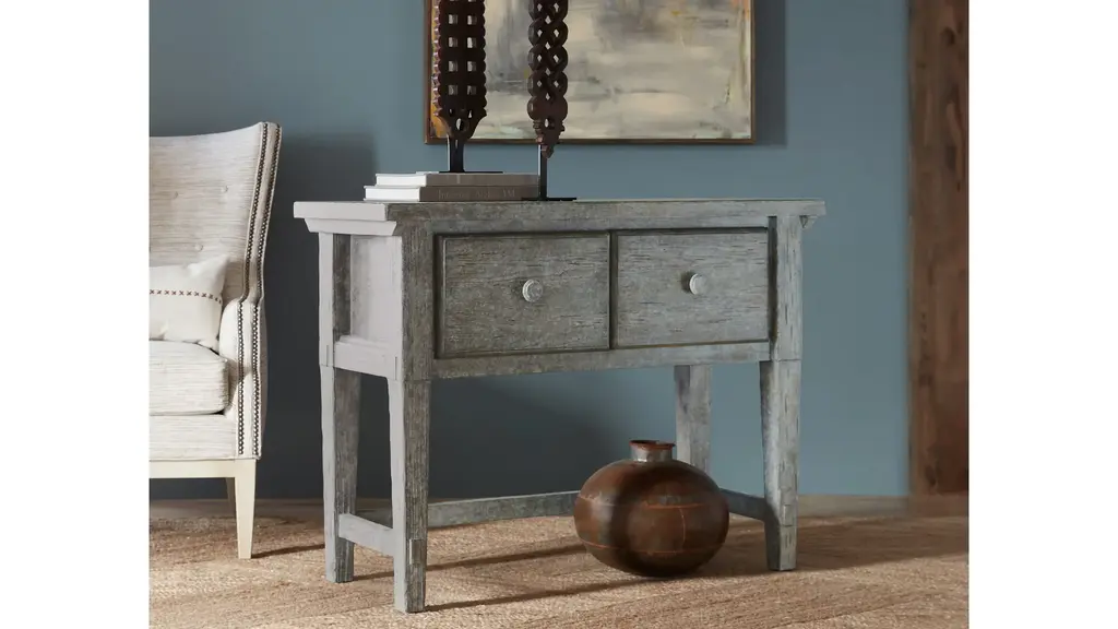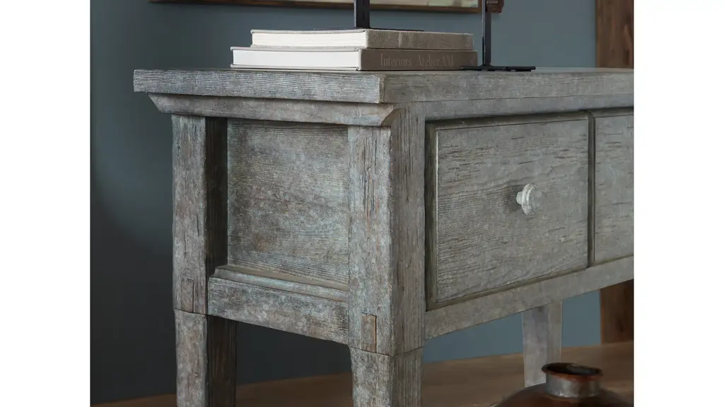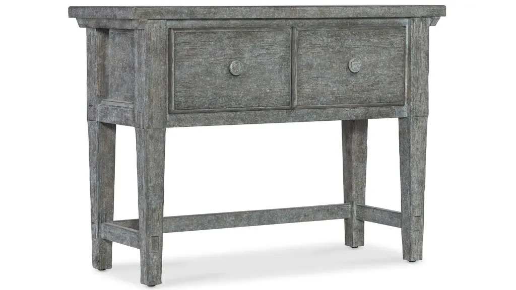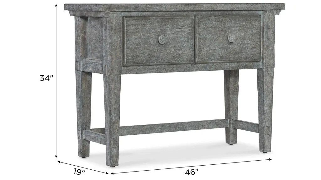 With a Belgian design aesthetic, the Commerce & Market Stonewashed Console expresses the elegance of simplicity and the essence of inviting casual style. Crafted of Pine Veneers with a distressed blue finish, tapered legs and an interlocking design on the stretcher and frame, it has two drawers with soft-close guides.