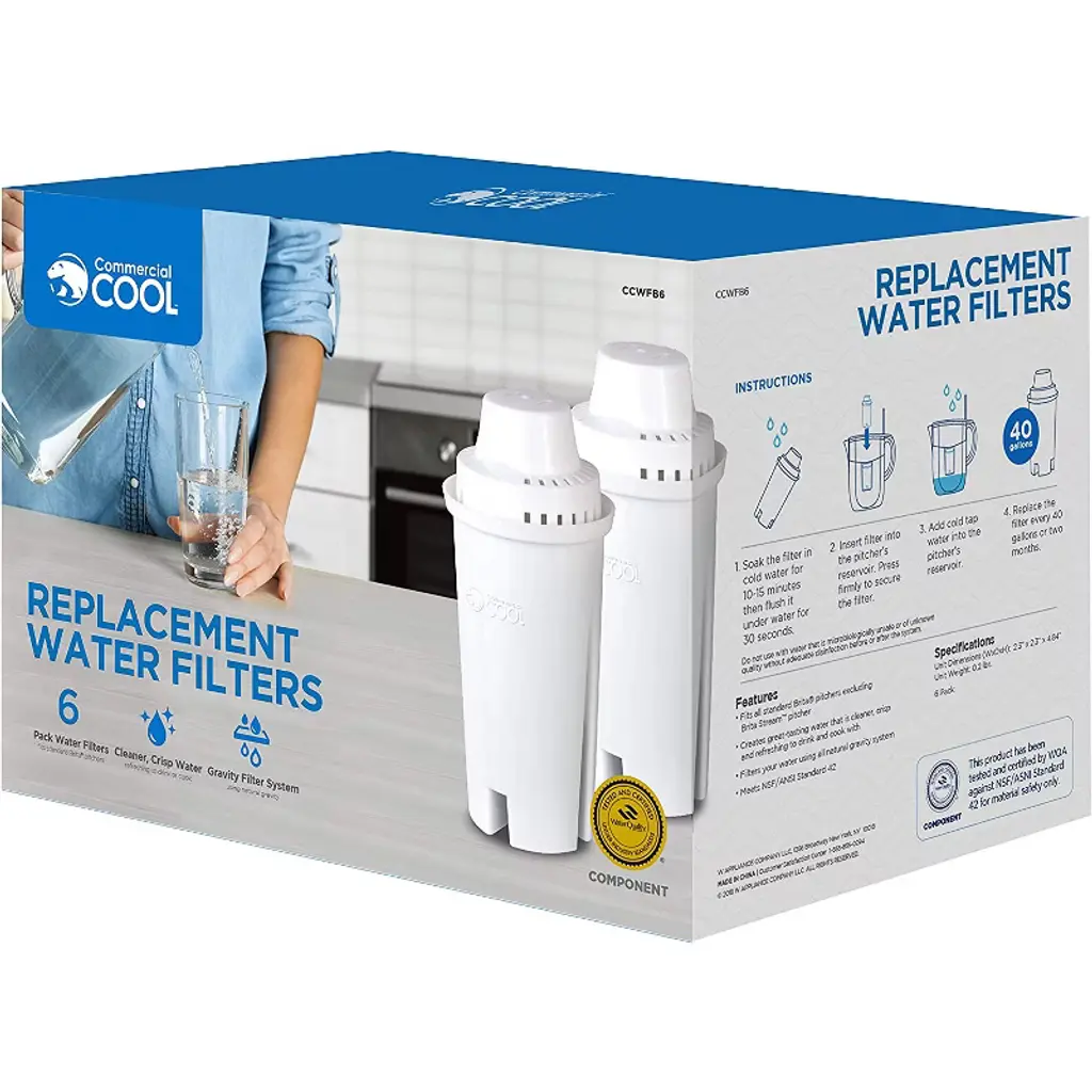 Why Commercial Cool Replacement Water Filter These Brita filter replacement for pitcher are Tested and certified by NSF/ASNI Standard. Brita water pitcher filter replacements are simple to install and use. This 6 pack bundle lasts you a year. Water filter replacement utilizes an all-natural gravity system with fine mesh technology that helps keep out alarming black fleck. Benefits of our water filters: Greatly improve the taste of your water so your family will stay hydrated. Reduce use of plastic water bottles. Save money purchasing water. Reduce copper, mercury, zinc, cadmium. Reduce chlorine odor and taste. Solve hard water problems. Instructions for use: 1) Soak your Commercial Cool filter in water for 15 minutes. 2) Rinse for 30 seconds. 3) Insert filter in pitcher's reservoir. 4) Press down firmly to secure the filter. 5) Add cold tap water to the filters reservoir. 6) Replace your filter every 2 months or 60 gallons. Start enjoying the peace of mind of clean, healthy water with Commercial cool filter. EPA Est. No. 95301-CHN-1.