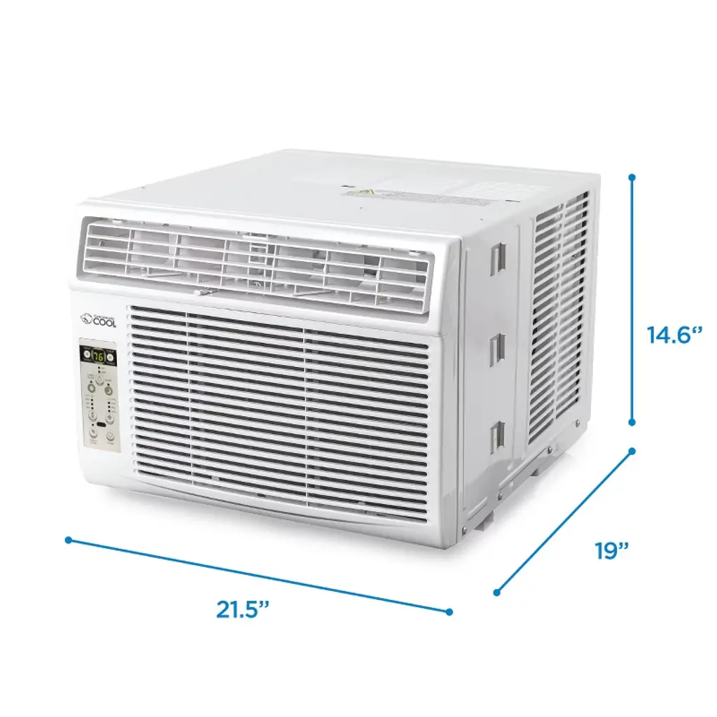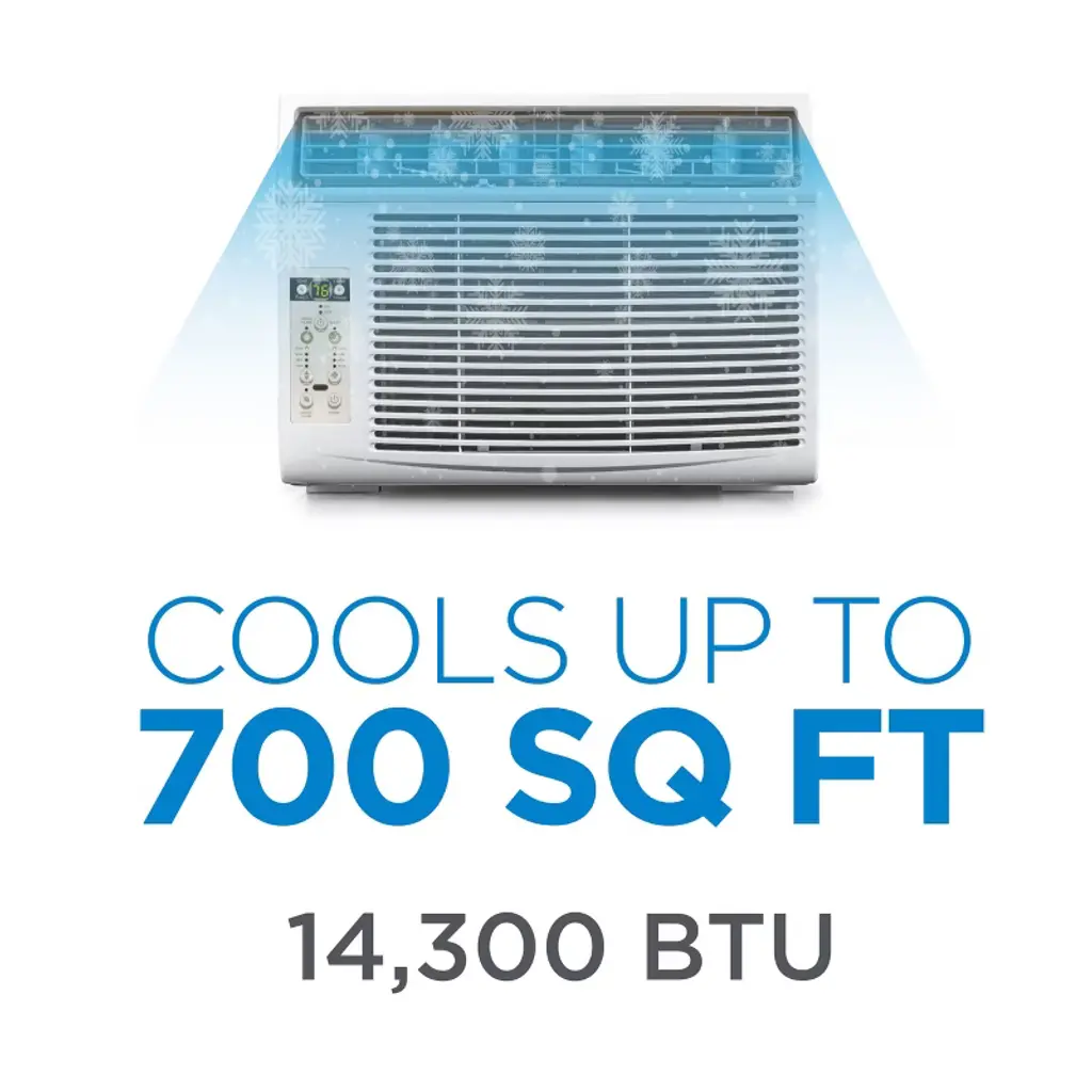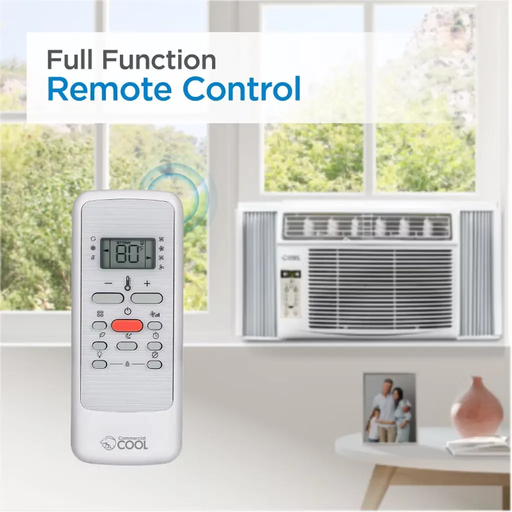 COMMERCIAL COOL 14300BTU window air conditioner offers a perfect solution for easy and convenient cooling where and when you need it most. Easily add breezy and cool air to any living area up to 700 square feet. Our window AC is perfect for large master bedrooms, living rooms, small apartments and other living spaces with a window available for installation. This ac unit for bedroom comes complete with electronic controls and a digital display along with a full-function remote control for added convenience. Other features include a removable washable filter, and easily adjustable thermostat control. With air cooler dimensions of 21.5" x 19" x14.6" and an air conditioner weight of 69.44 lbs., this window air cooler for room is easy to install, complete with an ac window seal kit and window ac installation kit. For use with double hung windows. Enjoy a temperature range of 62F to 89F with 4 modes: Cool, Auto, Dry, & Fan. Dehumidifier mode removes up to 60.72 pints of moisture per 24 hours. Additional air conditioning features include 4-way adjustable louvers, sleep mode, timer/clock function, energy saver, and fan only. 10.9 CEER, 1250 watts, 115V, 60Hz, 11.8A. 61.4 dB noise operation. 70.8"L power cord with LCDI-protected plug. R32 refrigerant. Considered a perfect ac for bedroom, room ac, and indoor ac unit -- our COMMERCIAL COOL air conditioner (CSA safety certified) is your summertime companion to keep cool days comfy. Remote control requires 2 AAA batteries (not included).