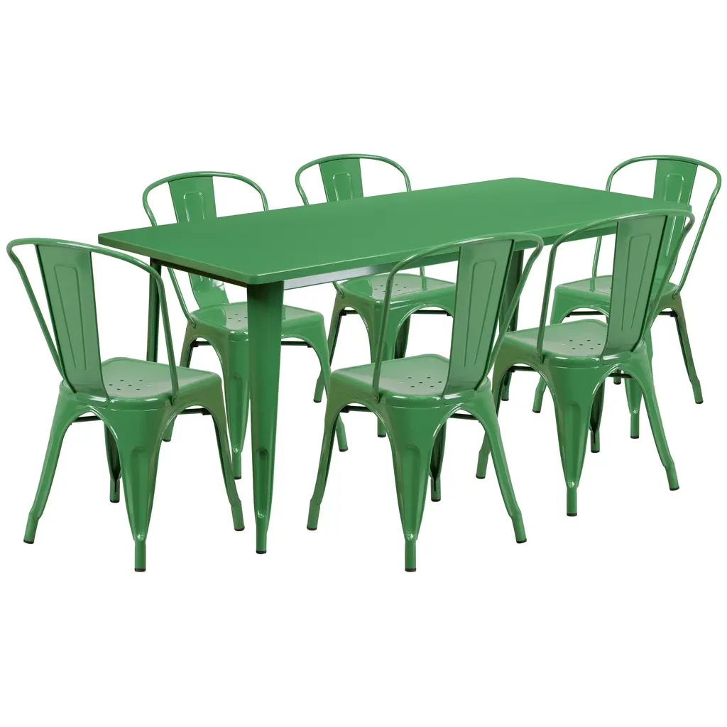 The indoor-outdoor rectangular metal table with six arm chairs will give your dining room or restaurant a cool retro-vintage look.The table top measures 31.5 inches wide by 63 inches long and has a smooth top with a 1 inch edge. A stabilizing brace underneath the top gives this table increased stability while still allowing ample leg room. The cafe style arm chairs feature curved backs with a vertical slat, integrated arms, and a cross brace under the seat for added support and stability. Plastic bumpers on the cross brace protect the finish when stacking them. Drain holes in the center of the seat allow water to drain, preventing rust. A smooth, powder coat finish protects the set from scratches and floor glides protect your floors when you need to move it.Designed for both commercial and residential use, this trendy table set will create a lasting impression whether you're serving customers or playing cards with friends.