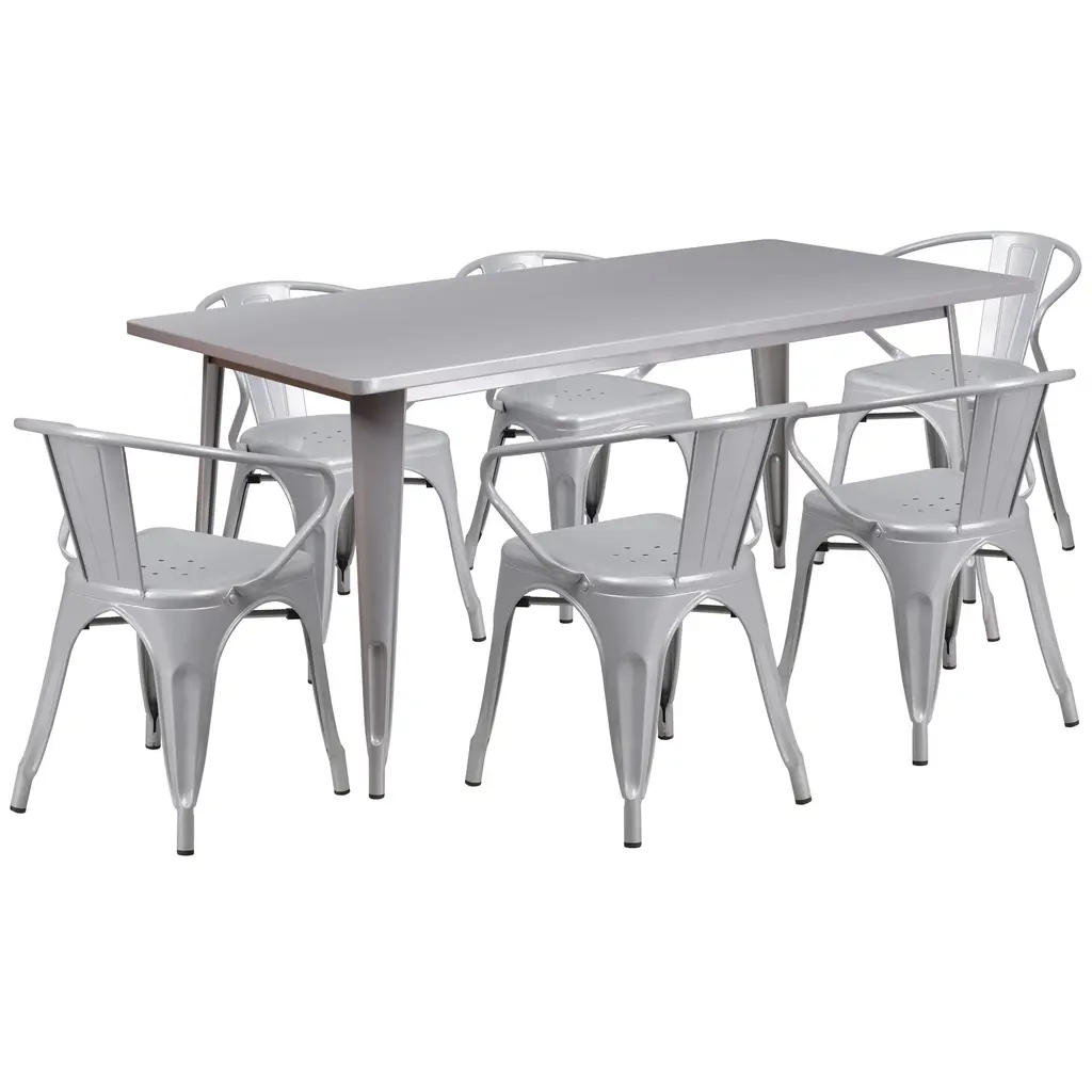 The indoor-outdoor rectangular metal table with six stack chairs will give the dining space in your home or restaurant a cool retro-vintage look. The table top measures 31.5 inches wide by 63 inches long and has a smooth top with a 1 inch edge. A stabilizing brace underneath the top gives this table increased stability while still allowing ample leg room. The bistro style chairs feature curved backs with a vertical slat, and a cross brace under the seat for added support and stability. Plastic bumpers on the cross brace protect the chairs' finish when stacking them. Drain holes in the center of the seat allow water to drain, preventing rust. The smooth, powder coat finish protects the set from scratches and floor glides protect your floors when you need to move it. Designed for both commercial and residential use, this trendy table set will create a lasting impression.