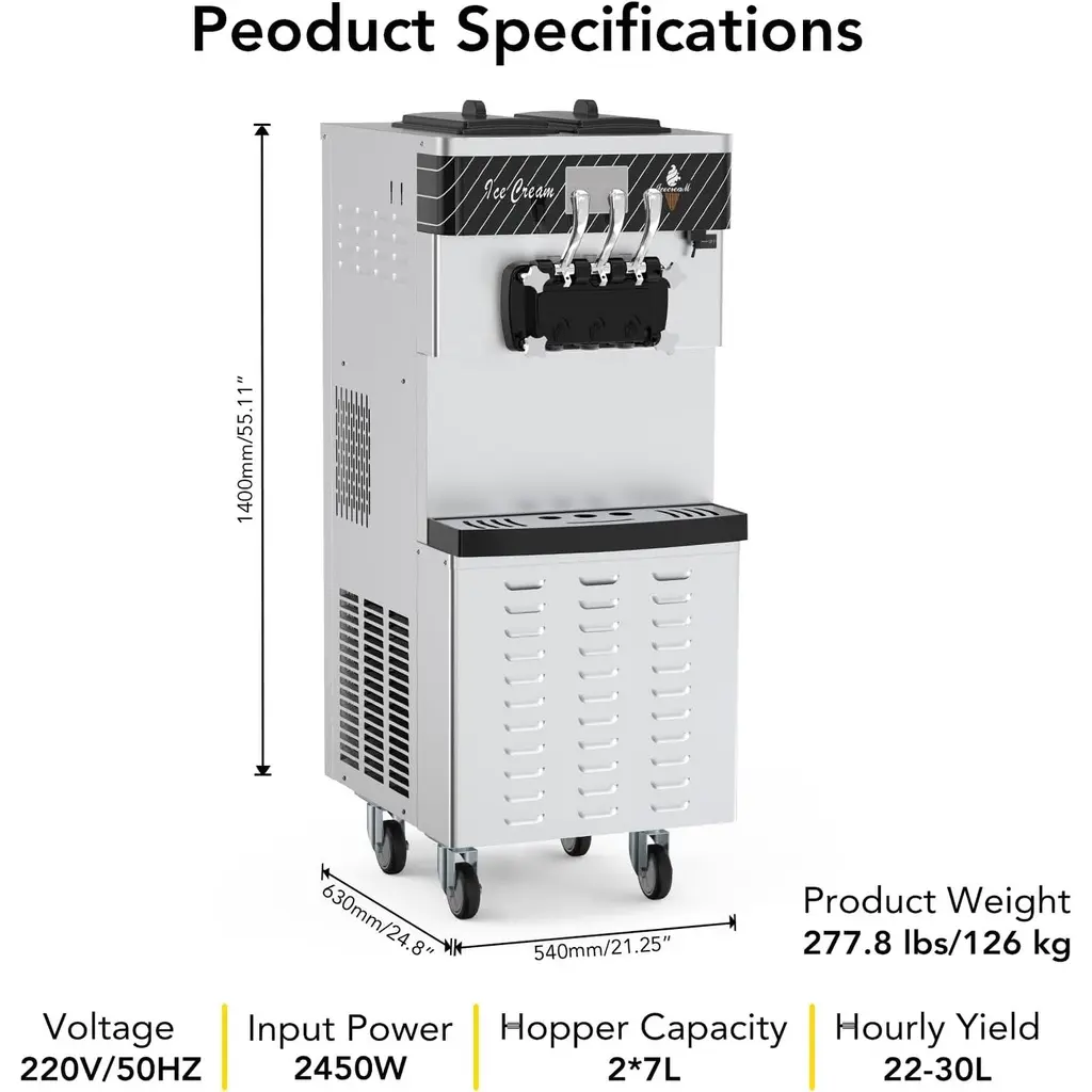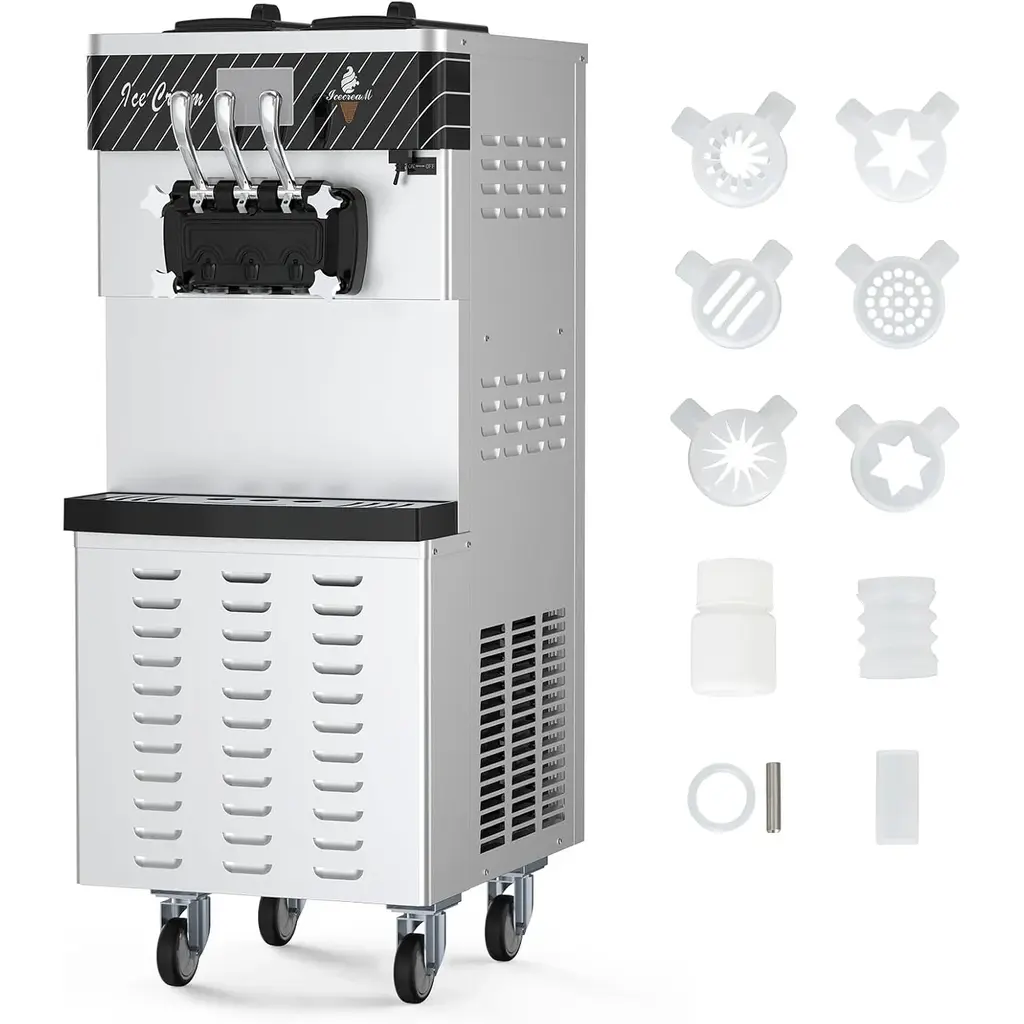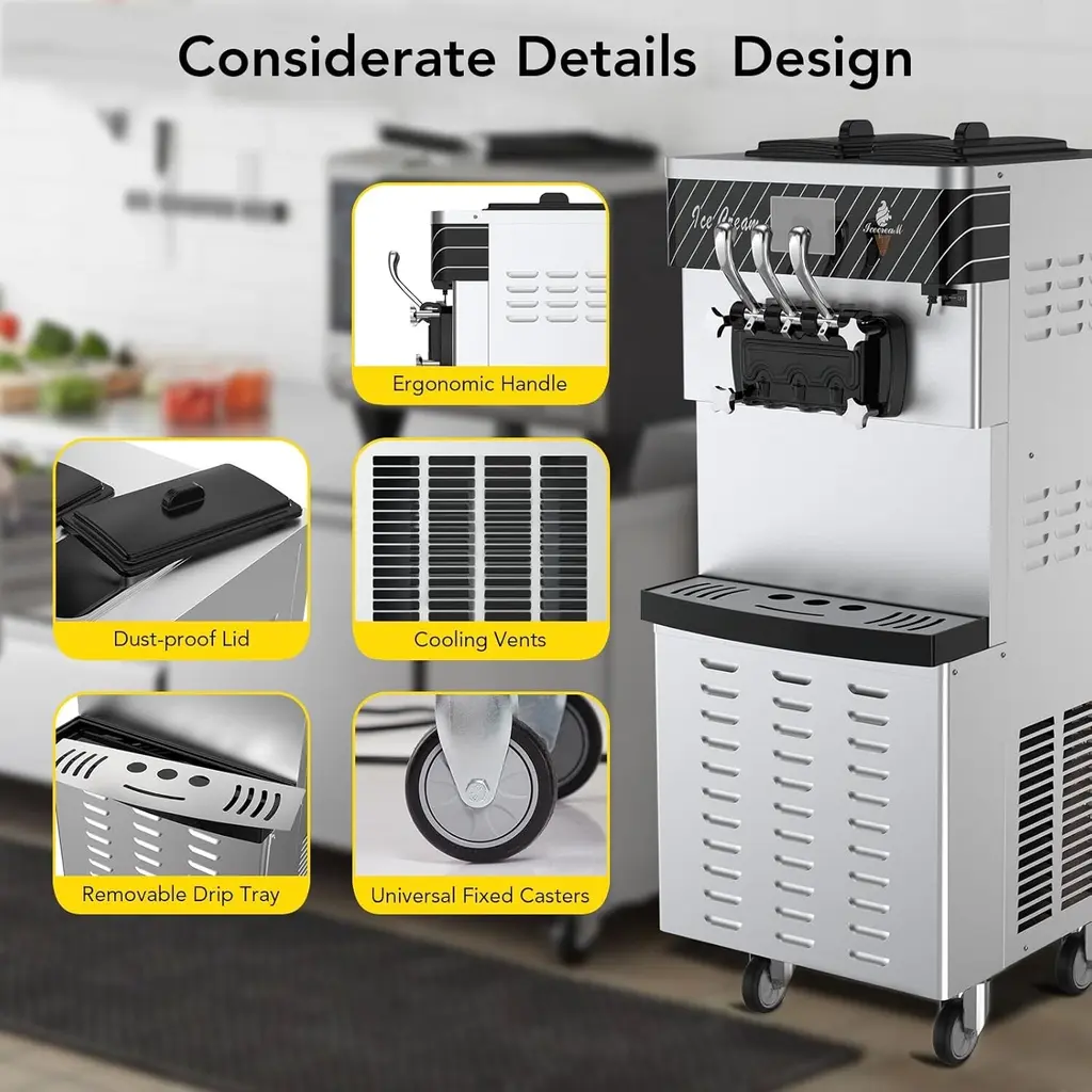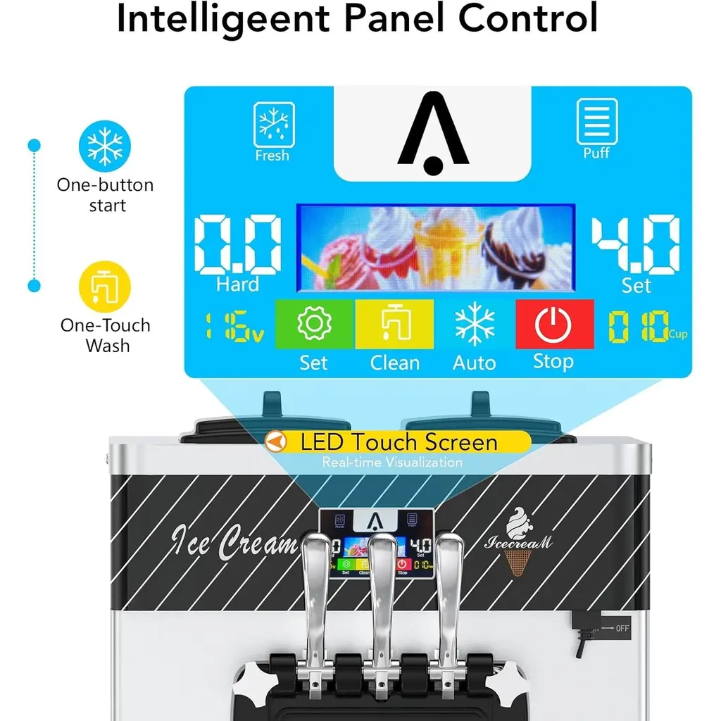 LCD Touch Screen - This ice cream frozen yogurt machine equiped with LCD Panel, simple buttons, you can directly see and control the amount of ice cream, hardness and temperature. 14L Large Capacity - This soft serve ice cream maker machine is equipped with a 14L capacity storage tank funnel, made of food-grade stainless steel. Due to the importance of the ice cream recipe, a standard ratio of water to ice cream powder (1: 2.5) is recommended. 3 Flavors- you can add your favorite foods such as vanilla, strawberries, chocolate, mango, etc to make smoothies or soft serve ice cream. Fits for supermaket, Amusement Park, beverage shops, dessert shops, cafeterias, restaurants, bars, milk tea shops, etc. Pre-cooling - This ice cream maker machine equipped with Pre-cooling and fresh-keeping function (freezer tank) to keep the ice cream slurry fresh at Night and not deteriorating, ensuring the food safety. One-button Cleaning - Pour water into the hopper, press the wash button, and the ice cream machine will clean automatically.