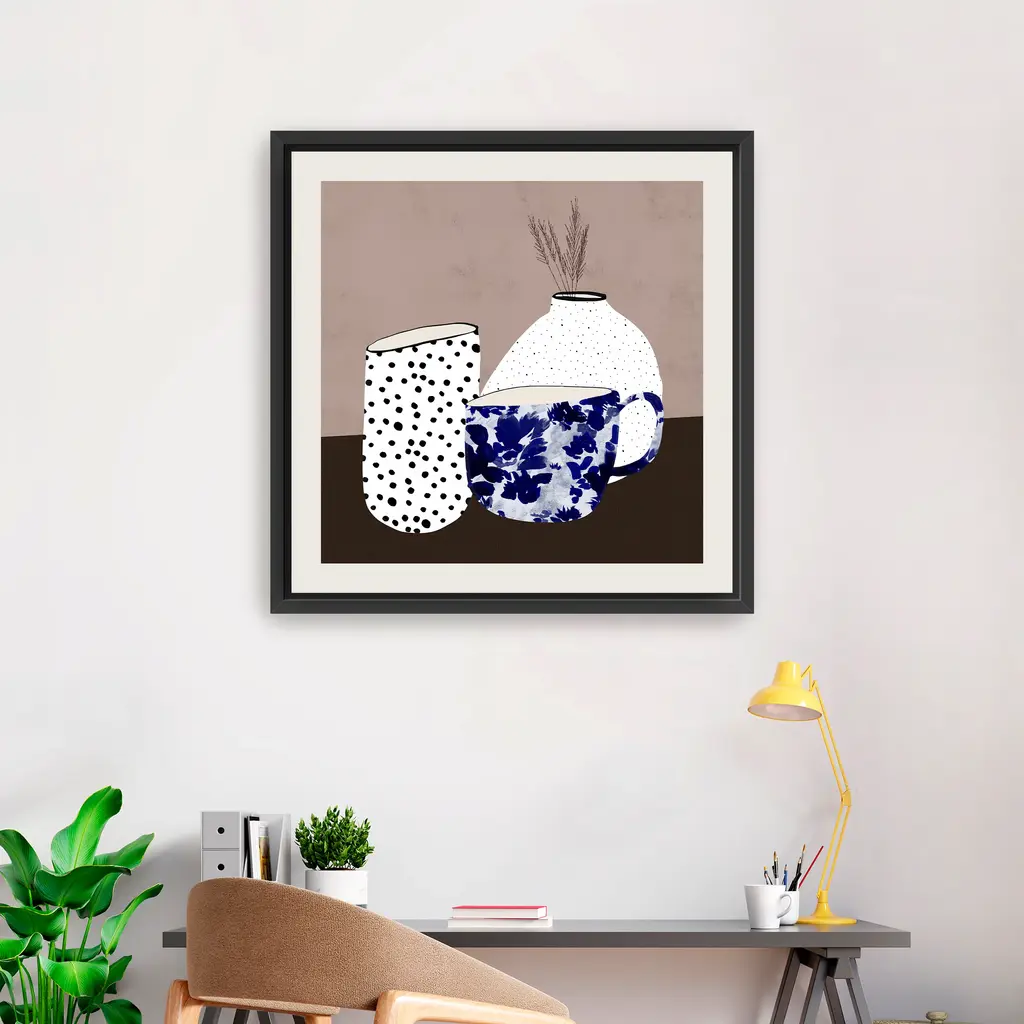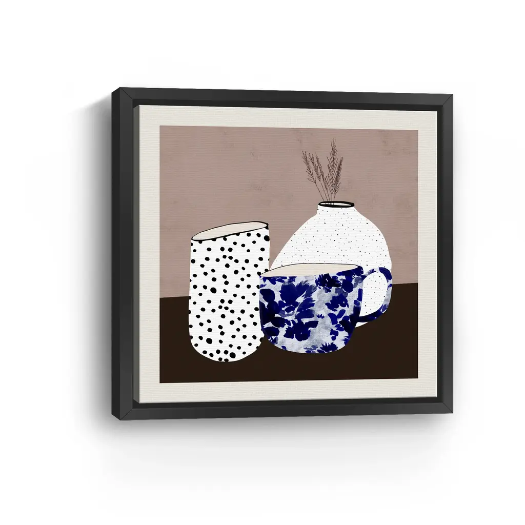 Elevate your decor with "Common Ground I" by Danushka Abeygoda, featuring beautifully crafted pots and vases in serene hues of blue against a neutral backdrop. The harmonious blend of soothing blue tones and the minimalist background creates a calming and sophisticated ambiance, perfect for any room. This versatile piece effortlessly complements both contemporary and classic interiors, making it a perfect addition to your home. Available in black frame, dark walnut frame, oak frame, or as a frameless canvas. Our Gallery Wrap Canvas Prints are proudly assembled with high quality materials in California, USA. Each piece is printed on a thick, archival grade canvas using Giclee technology. It is then hand-stretched by our experienced artisans over solid wood bars, which will not warp over time. The final product is a piece personally crafted for you to confidently display on your wall. Care and Assembly: Ensure that the location of your piece has little to no exposure to heat, sunlight, and moisture. Wipe clean, only if needed. Each piece includes a sawtooth hanger to hang on your wall horizontally.