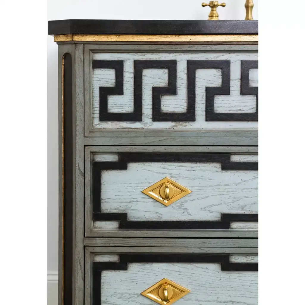 Inspired by neoclassic Italian design. Made of Mindi wood finished in two shades of grey with black and gold accented decoration. Solid polished brass hardware. Two over sized drawers provide storage. Polished Absolute black granite top. White porcelain undermount sink.