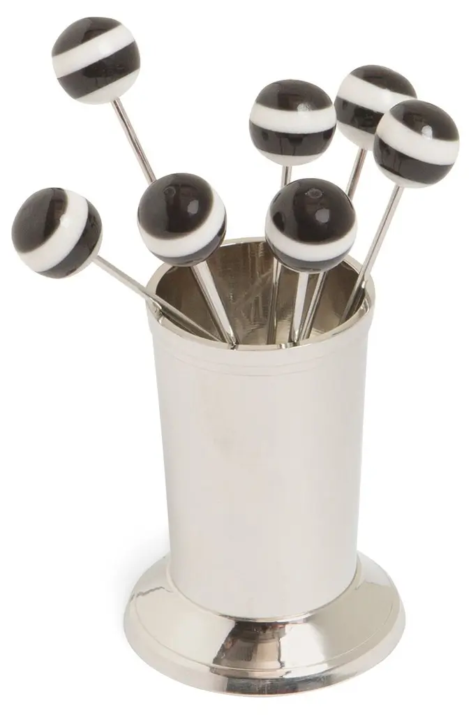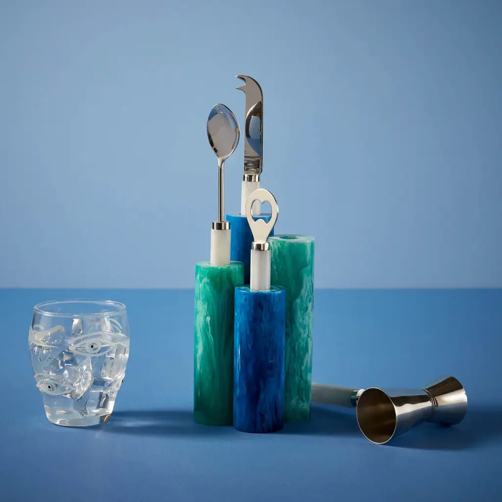 Translucent Treats. Our marbleized Como Barware Set brings one-of-a-kind shine to your next cocktail hour. Featuring a tonal blue stand that holds four stainless steel bar tools with white acrylic handles. All acrylic is hand-poured and polished to luminous perfection. Set includes a spoon, a bottle opener, a double jigger, and a knife.