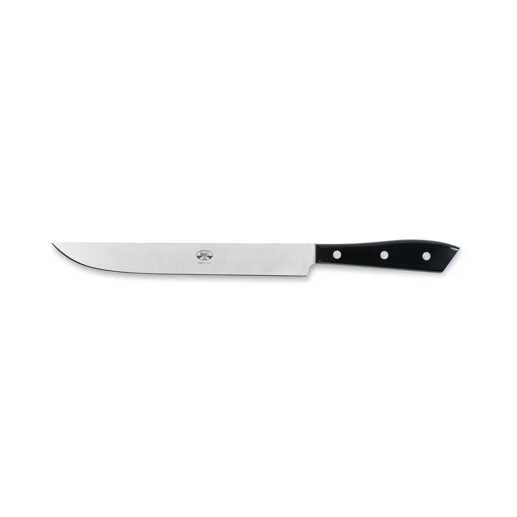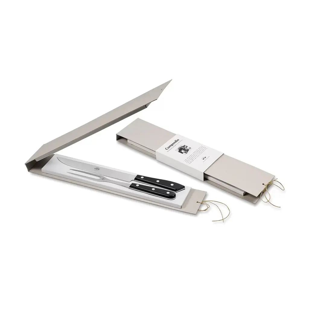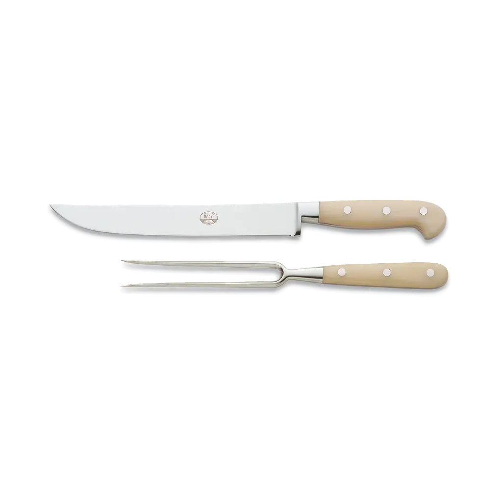 The Compendio Polished Carving Set is a lovely serving ware design by the Tuscan, family-owned business Coltellerie Berti. Handmade from beginning until end, the bundled slicing knife and carving fork are individually crafted and signed. Each piece is made of a stamped carbon steel and stainless steel blade and a lucite handle. The latest technology from Coltellerie Berti, the steel blend makes these heirloom-quality dining accessories lightweight but strong as ever, and the knife’s convex shape helps the blade stay sharper for longer.