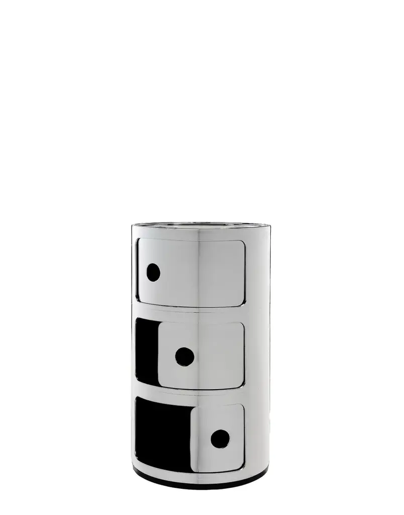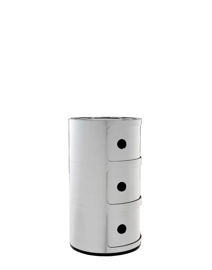 The modular elements were designed to meet different needs and to fit perfectly into every room in the home. Componibili first appeared in 1967 and have since become a timeless furnishing classic. Today’s Componibili are 32 cm in diameter and come in three sparkling metallic finishes. This model is available in two fixed compositions of two or three non-stackable elements.