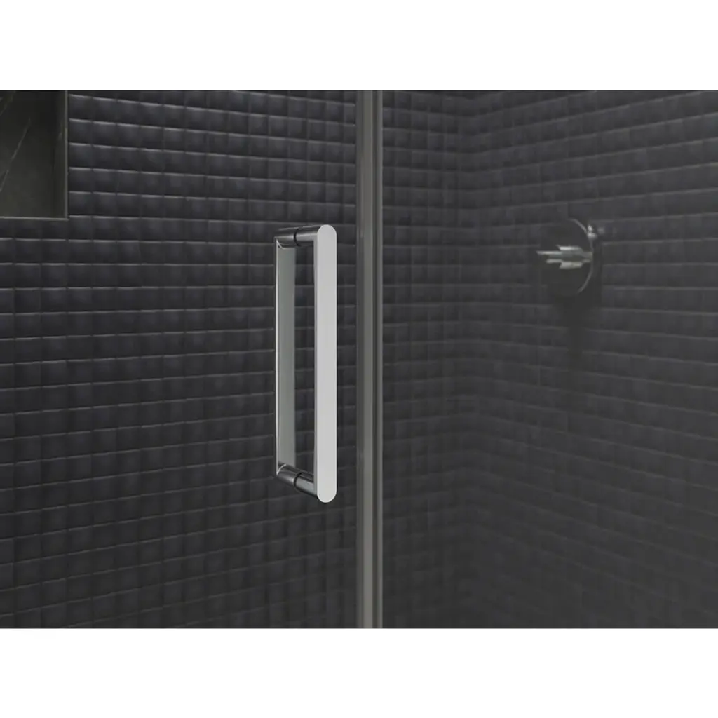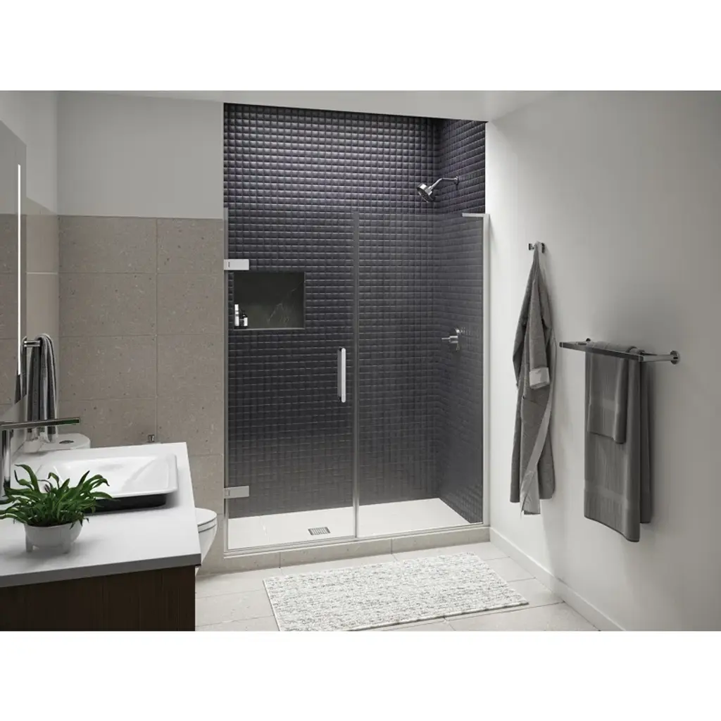 Add the final touch to your showering space with the luxurious composed frameless pivot shower door. This contemporary design includes an innovative in the bracket that secures the fixed panel in place and gives a sturdy feel while also being unobtrusive to the showering space. This 3/8-in thick crystal clear shower door includes a magnetic seal on the moving panel to securely close the door for exceptional water containment. Beautiful back-to-back vertical door pulls for easy entry and exit complete the modern minimalist look. Simple installation includes 3/8-in out-of-plumb adjustability on both the fixed and moving glass panels. The composed frameless pivot shower door naturally compliments composed faucets and accessories.