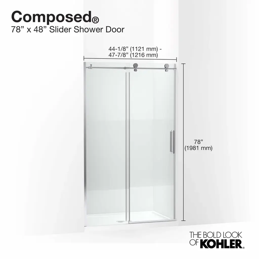 Add the final touch to your showering space with the luxurious, frameless composed sliding shower door. This contemporary design includes exposed rollers engineered to glide across a heavy-duty top rail, offering a bold style statement and smooth operation. The door offers ample head clearance and features beautiful back-to-back handles for easy entry and exit. This shower door includes heavy 3/8 in. thick tempered glass and controlled close technology on the sliding panel to securely close the door for exceptional water containment. Simple installation includes out-of-plumb adjustability of 3/8 in. on both the fixed and sliding glass panels.