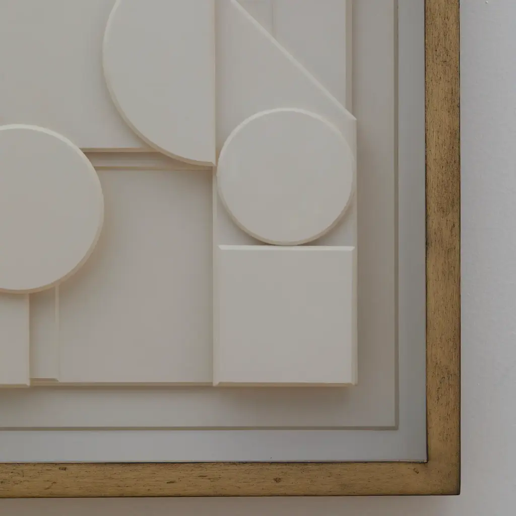 Minimalist yet richly dimensional, Composition en Blanc is a study in balance, proportion, and shadow. Geometric forms—circles, squares, and angular planes, emerge from a crisp white surface, their interplay shifting subtly as light moves across the relief. The result is a work that is at once serene and dynamic, recalling the purity of mid-century geometric abstraction while feeling entirely of the present moment.Crafted on fine art board with hand-cut and layered forms, the piece achieves depth through its tactile construction rather than color, making it a masterclass in restraint. At a versatile 15”W x 20”H, it is equally suited to intimate spaces or as part of a curated gallery wall. Float-mounted within a slender wood frame and protected by an acrylic cover, it’s designed for both longevity and visual impact.