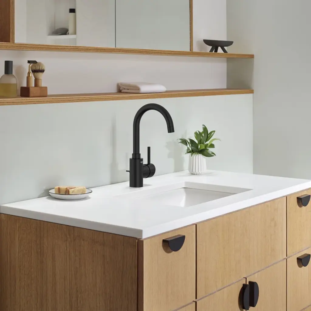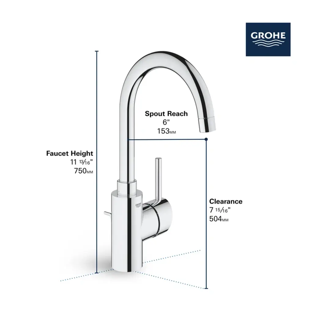 The GROHE Concetto Single-Hole Bathroom Faucet makes a statement with its high-arc spout and clean, minimalist lines. This single-handle bathroom faucet offers smooth control of water flow and temperature with the exacting precision characteristic of the GROHE standard of excellence. Available in an array of exquisite finishes that add interest to every bathroom