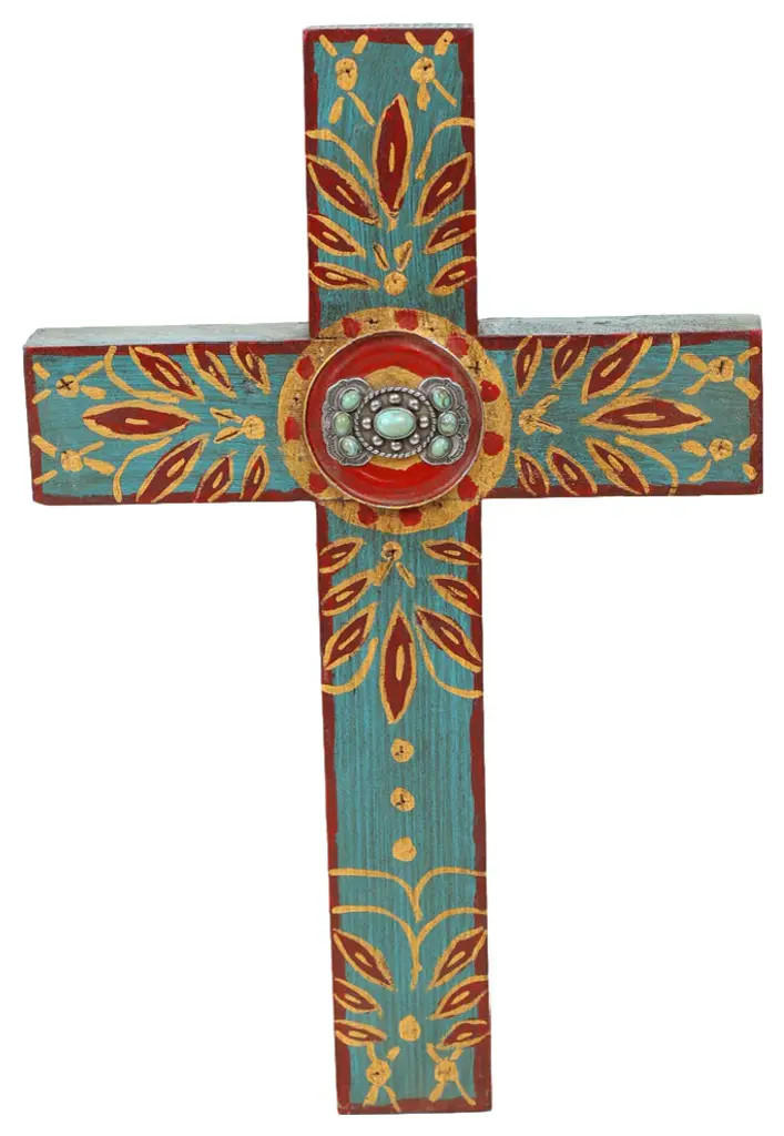 Concho Handmade Wooden Cross 11x17", Turquoise
