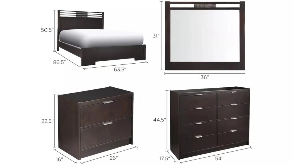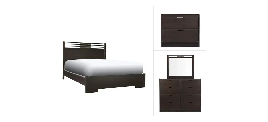 Bring home contemporary style with the Concorde 4-pc. queen platform bedroom set. Its streamlined, modern look is beautiful in its simplicity—clean lines and a rich dark chocolate finish are enhanced with modest brushed silver drawer pulls, glass tops, and headboard and mirror slats that decorate without overwhelming.