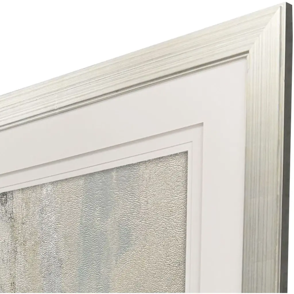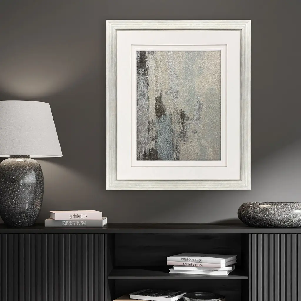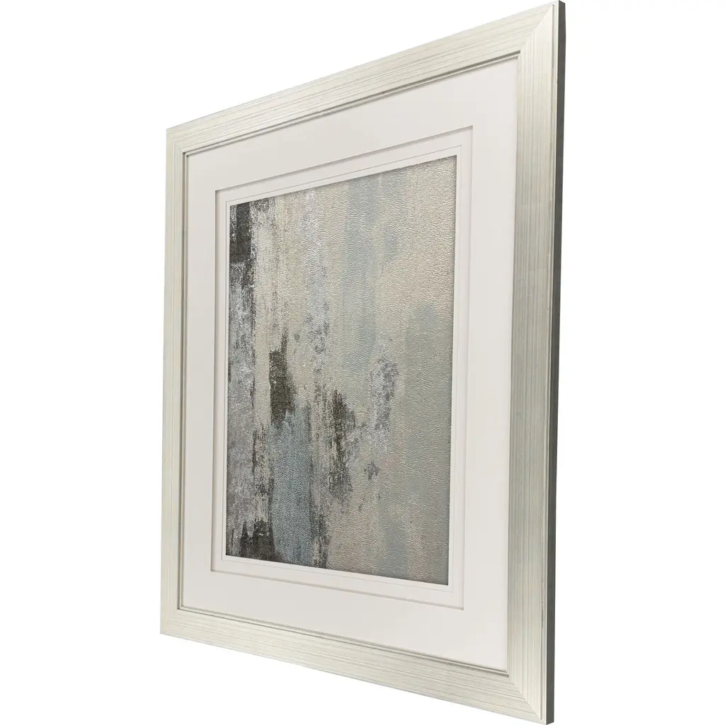 Exclusive hand finished mixed media with silver leaf accents. Matted in white with raised matting and framed in a modern silver leaf wood.
