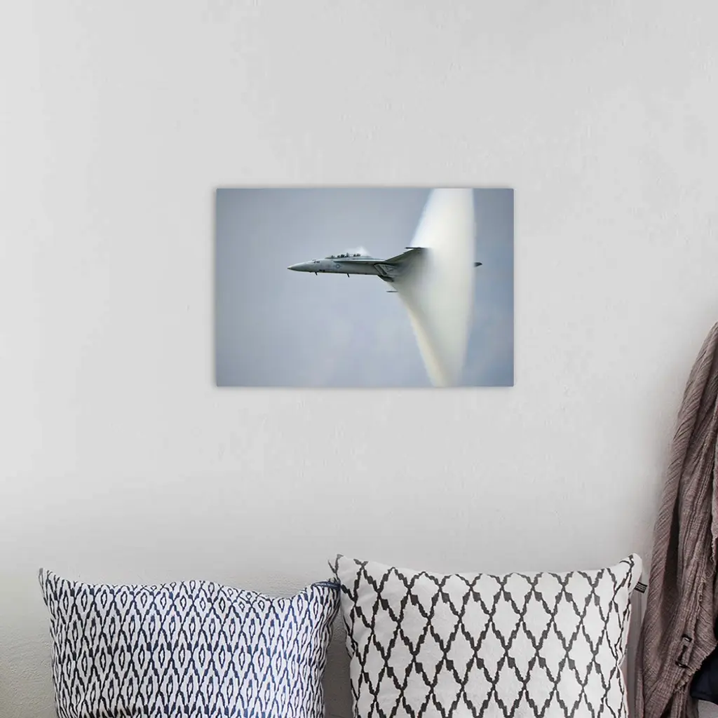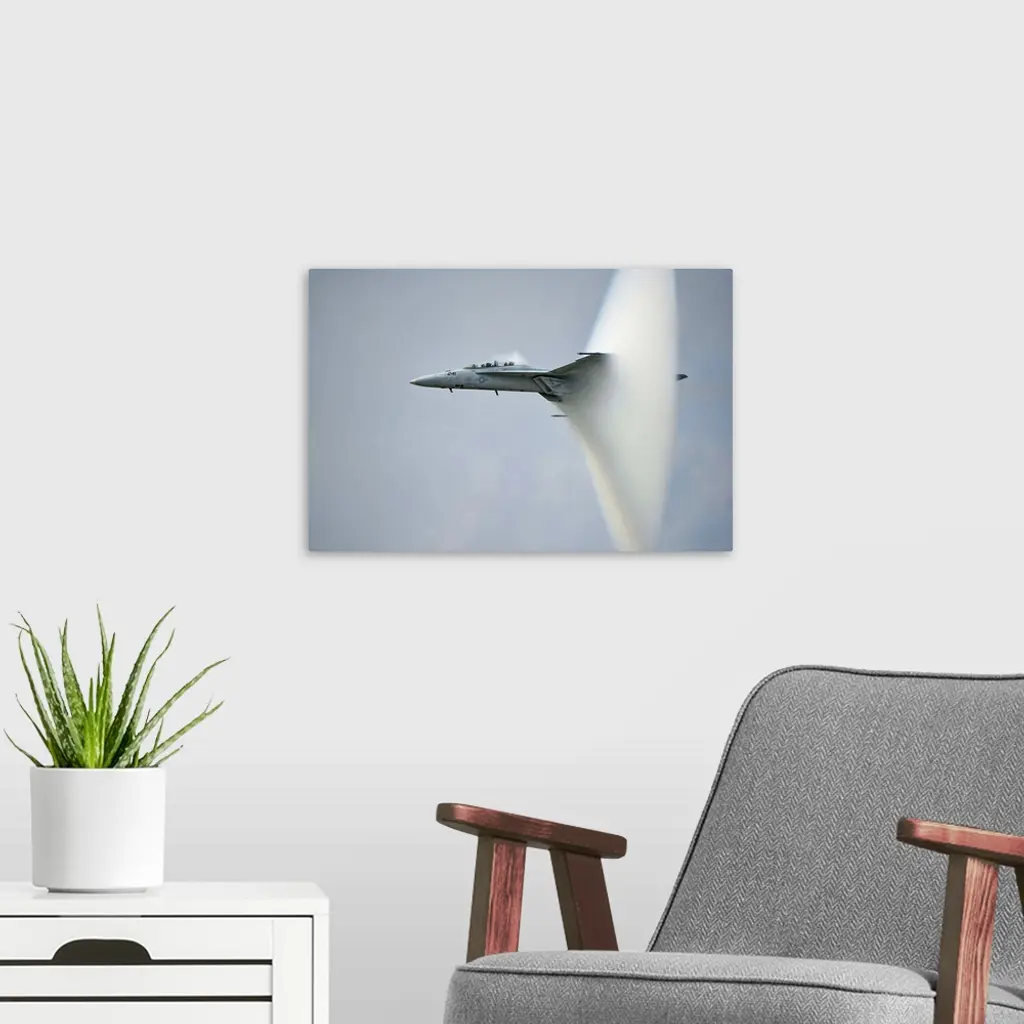 A F/A-18 Super Hornet forming a cone of air as it breaks the sound barrier.