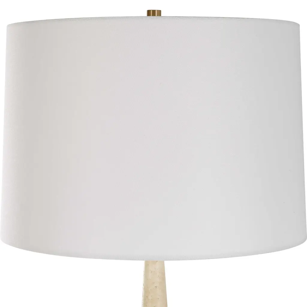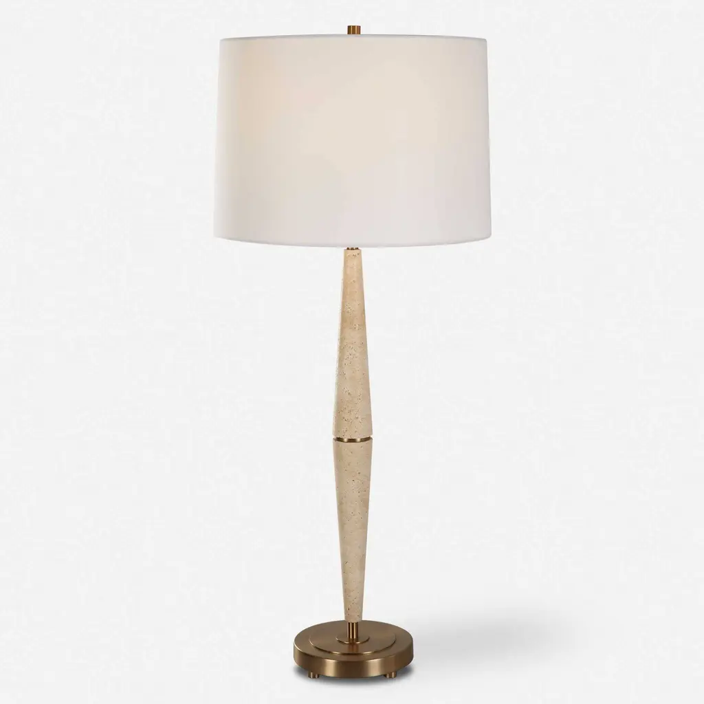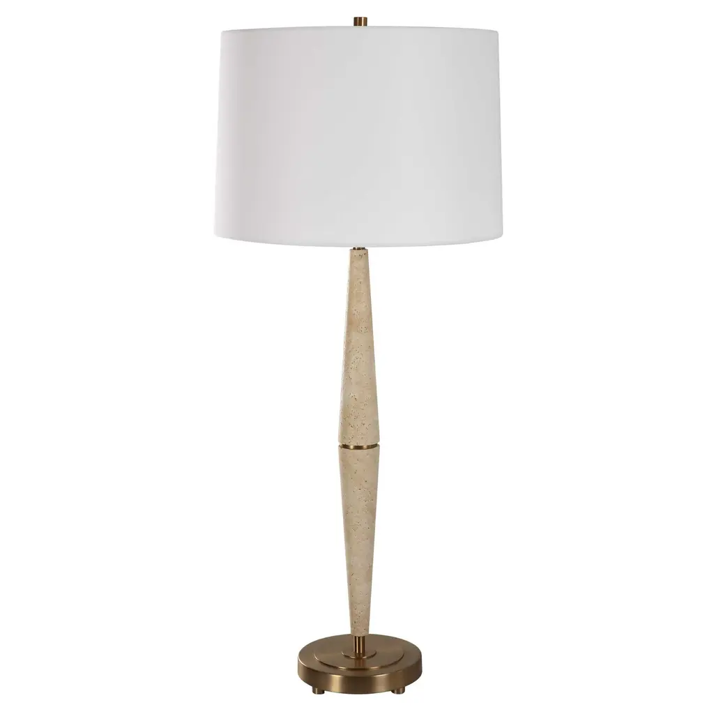 Elevate your decor with our unique table lamp, a harmonious blend of modern silhouette and textures. Two cone-shaped travertine are gracefully separated by iron details, finished in plated brushed brass. The slightly tapered round hardback shade, adorned with white linen fabric, adds a touch of simplicity and sophistication, making it a versatile statement piece that seamlessly combines elegance with contemporary style. Product Features: Beige table lamp with white shade Lamp features a two cone shaped design Accented with plated brushed brass base Tapered round shade Is covered in a fabric Lamp uses (1) 150-watt E26 bulb - not included Socket type: 3-way Switch type: socket switch UL listed for indoor use only Dimensions: Overall height: 37.5" high Base diameter: 7" diameter Shade top dimensions: 11" high x 15" diameter Shade bottom dimensions: 11" high x 16" diameter Material(s): iron/travertine/linen fabric