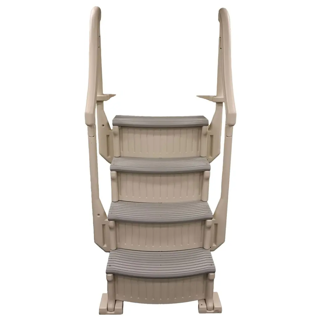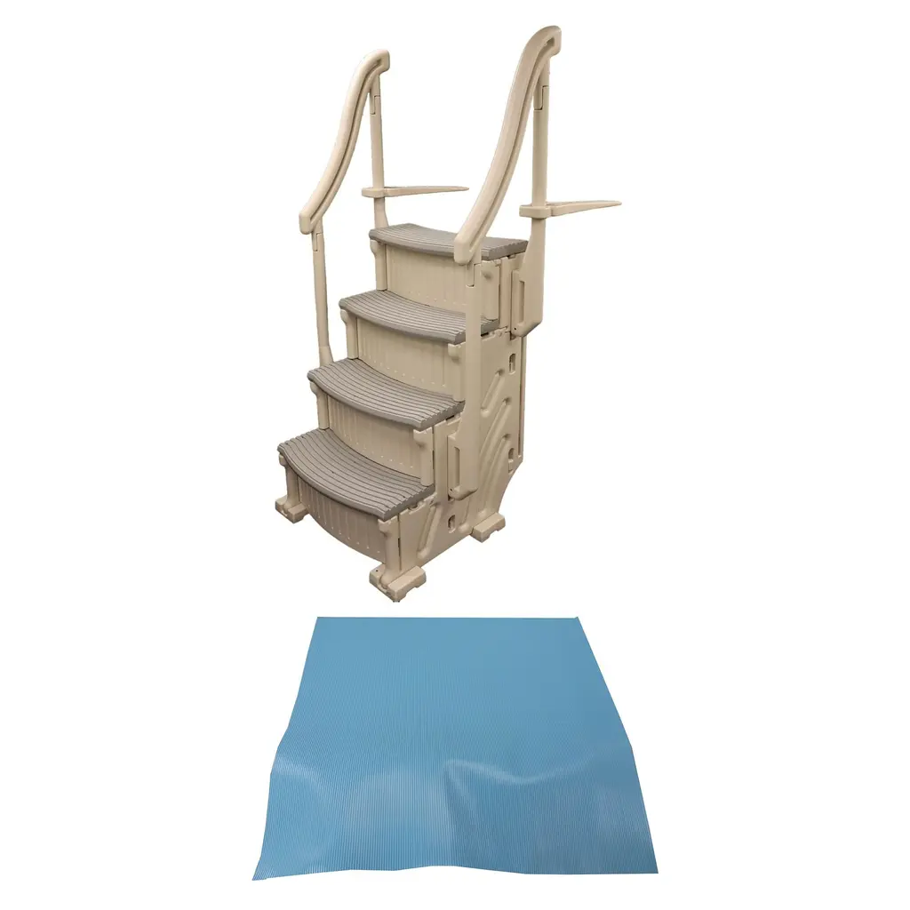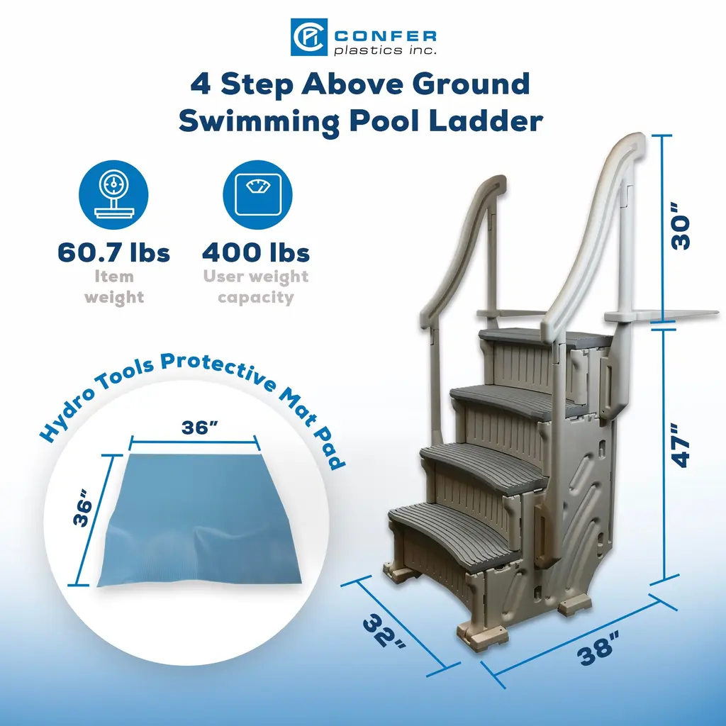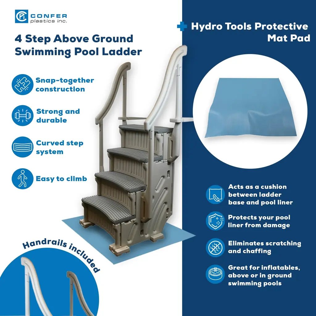 Transform your above-ground pool experience and extend the life of your pool liner with the Confer Plastics Curved In-Pool Step System and Hydrotools by Swimline Ladder Mat. Featuring a 2-tone color scheme of beige and gray, these above ground pool steps complement any pool. The curve system has the sweeping "wedding cake" look that many homeowners want in a pool step, and you can customize the stairs by curving the treads inward or outward depending on your desired look. The eye-catching, sloping handrails offer reliable stability while the capacity of up to 400 pounds accommodates swimmers of all sizes. Suitable for any above-ground pool, this 4 step staircase requires 20 pounds of sand for the sidewalls (sand not included), ensuring a secure and worry-free swimming experience. With adjustable base pads, you can compensate for a slightly dished pool floor to ensure a sturdy foundation. Swimline's 36 x 36-inch heavy-duty protective pool step pad acts as a barrier to keep your liner safe from ladder scuffing and standard wear-and-tear. Simply lay your mat on your pool floor under your ladder, and let the padding do the rest. The mats' innovative ribbed base construction ensures it will not float away, and you can customize the size of the mat by simply cutting it down to your desired measurements. With the Confer Plastics Curved In-Pool Step System and Swimline Ladder Mat, you've got a dynamic duo for enhancing your pool time. Easily enter and exit your pool, while protecting your pool's liner with this curve pool step system and ladder mat Steps support up to 400 pounds and include 2 side handrails and 4 large steps to provide stability when entering and exiting your pool Can be assembled with treads curving inwards or outwards depending on your preference; Weigh down by adding 20 pounds of sand to the sidewalls; Sand not included Ladder mat designed with heavy-duty vinyl, acting as a barrier to keep your liner safe from ladder scuffing and standard wear-and-tear 36 x 36-inch pre-cut size can be easily customized to desired shape and dimensions Confer Plastics Curved In-Pool 4 Step Ladder System, Above Ground Pool Stairs Adjustable base pads help compensate for a slightly-dished pool floor Appealing 2-tone color scheme of beige and gray complements any above-ground pool Start with base step unit staircase and expand into a complete curve system at any time Overall measures 32 inches deep, 38 inches wide, and 47 inches to the top step Height to top tread: 47 inches Handrail height (from top step): 30 inches Complete curve system width: 58 inches Mounting bracket length: 24 inches Weight limit: 400 pounds Color: Gray Step dimensions (D x W x H): 10 x 27 x 11 inches Overall dimensions (D x W x H): 32 x 38 x 85 inches Hydrotools by Swimline Protective Ribbed Ladder Mat/In-Pool Step Pad, 36" x 36" Simply lay on your pool floor surface under your ladder Innovative ribbed base construction ensures that your ladder mat will not float away after installation Thick, waterproof material built to sustain standard everyday wear and tear Material: Vinyl Color: Light blue Dimensions (L x W x H): 36 x 36 x 0.25 inches Weight: 0.75 pounds Manufacturer warranty: 5-year warranty (pool step only)