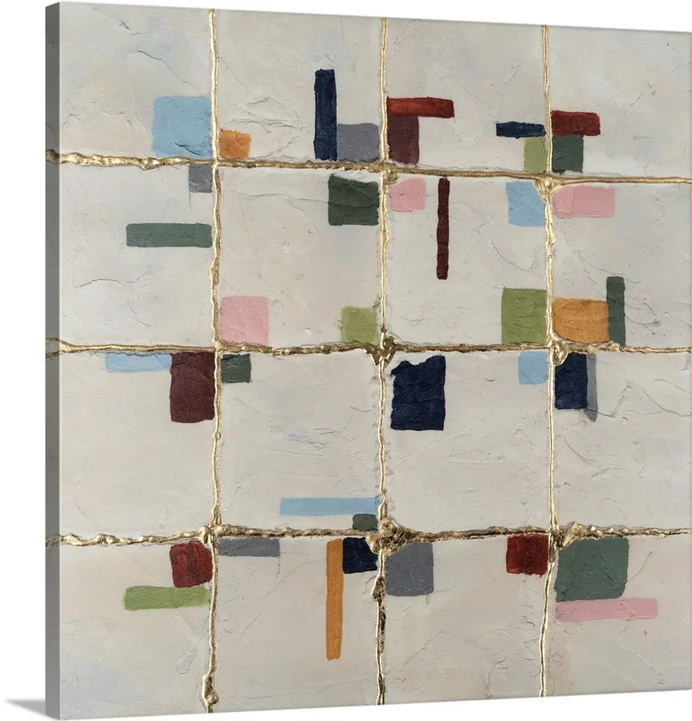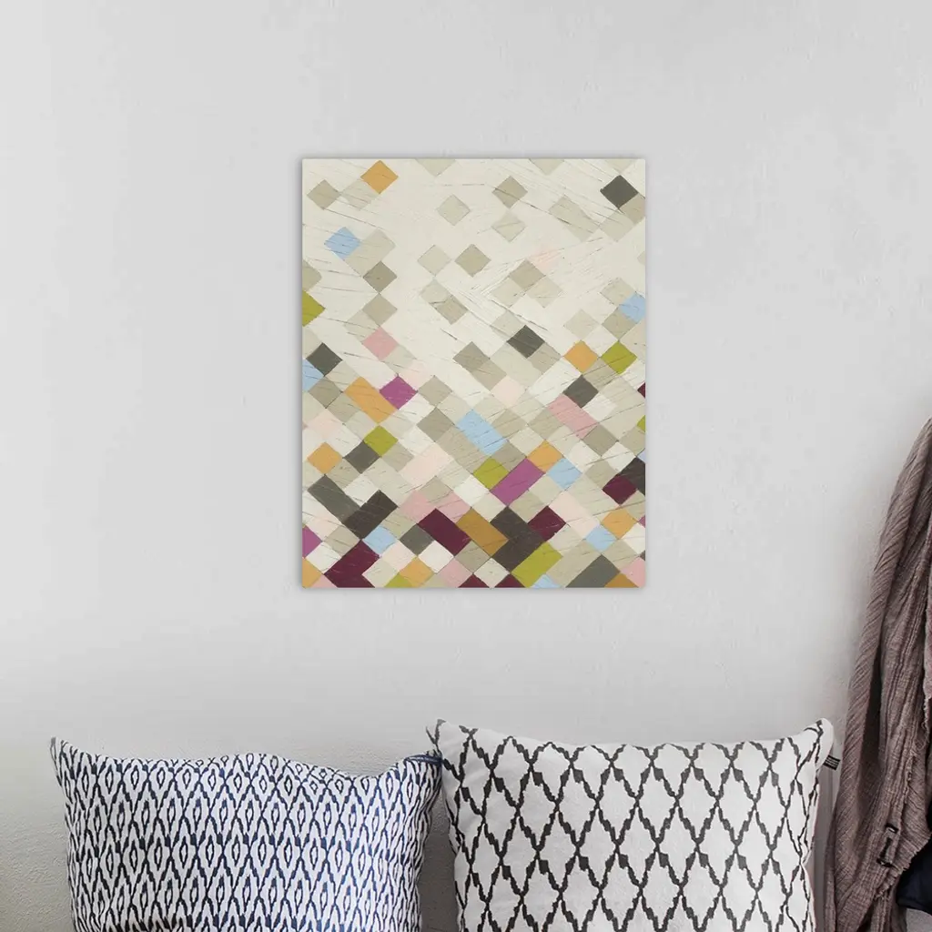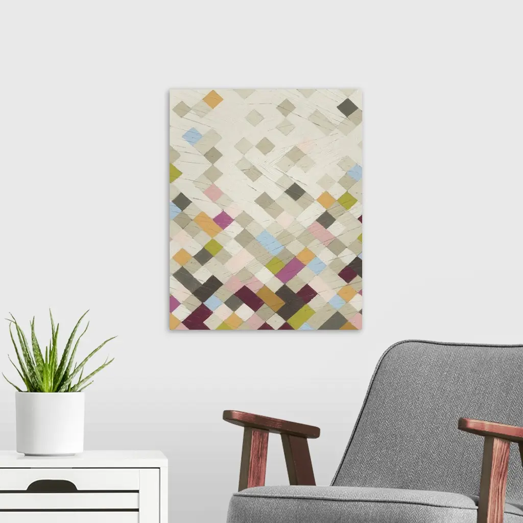 Contemporary abstract art using lattice diamond patterns in soft colors.