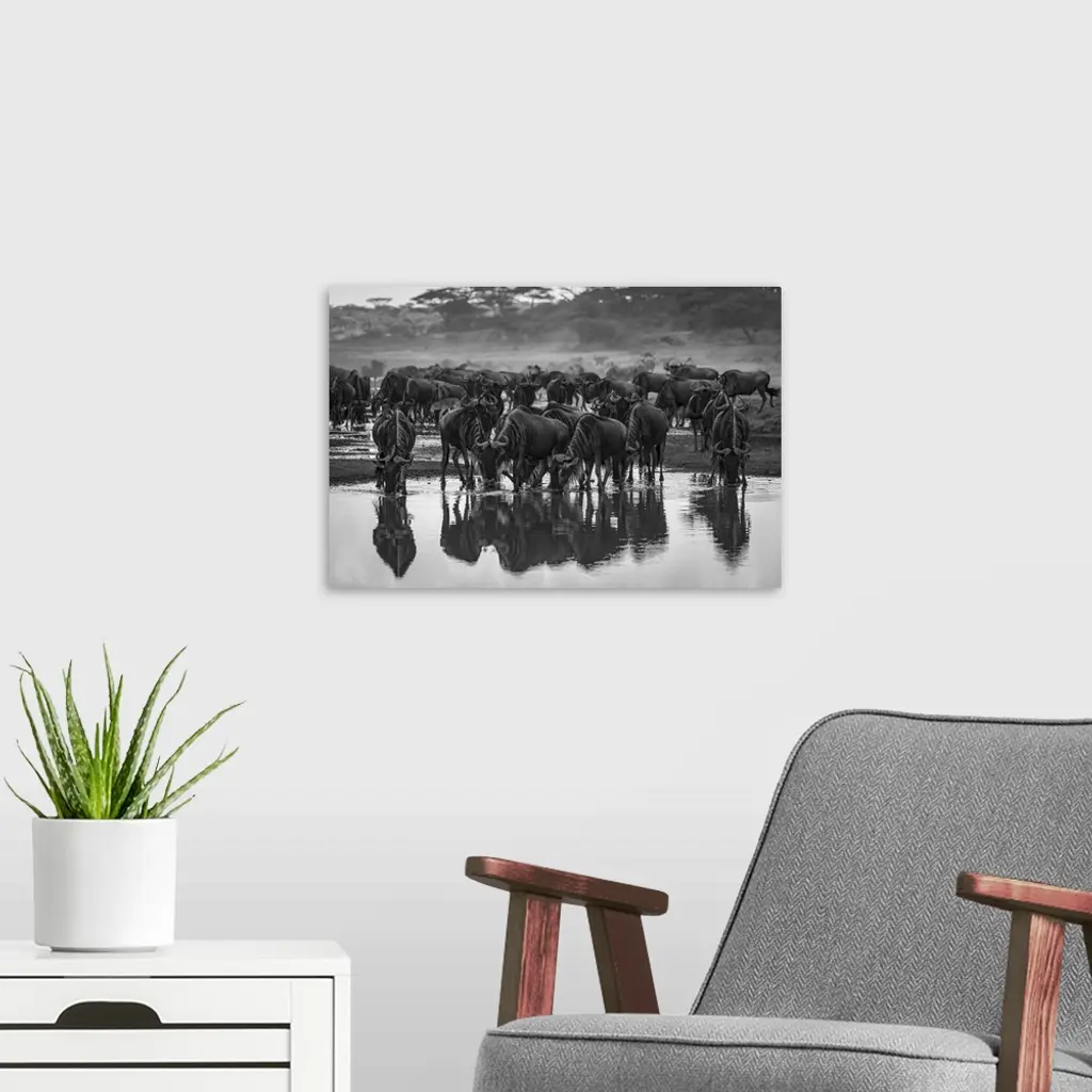 Monochrome confusion of wildebeest (connochaetes taurinus) drinking from stream, Serengeti national park, Tanzania.