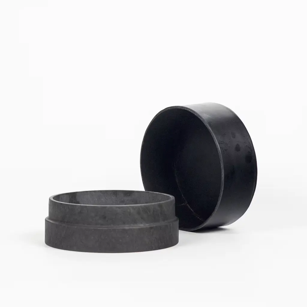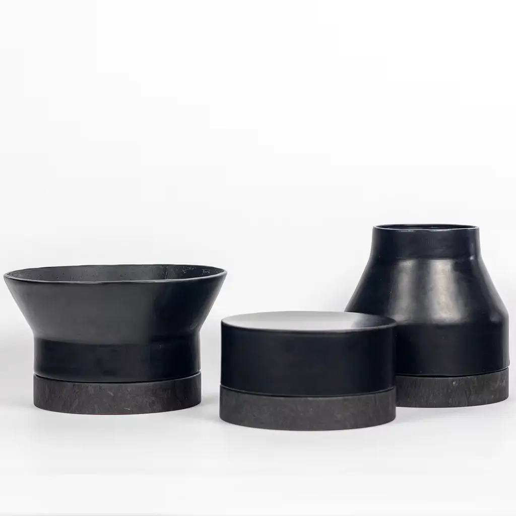 Like the sun and the moon, or hot and cold, stone and leather come together as a perfect contrasting combination. This stylish container, unique in its geometric shape, is made of Tunisian stone, machine-turned to complete three different shapes in leather, beaten on wooden molds, through a snug fitting that will determine the different possibilities for their use.