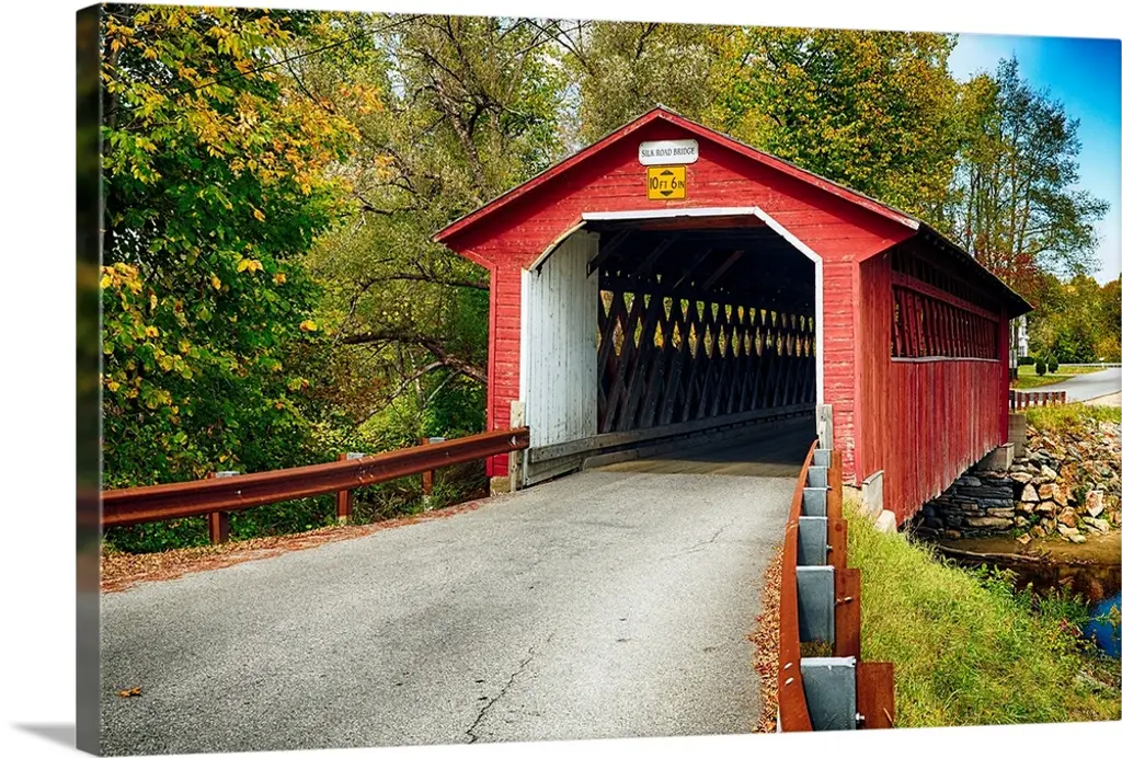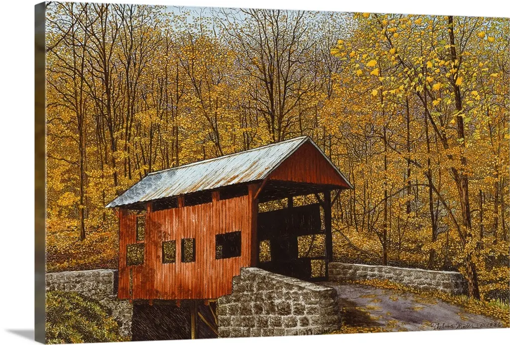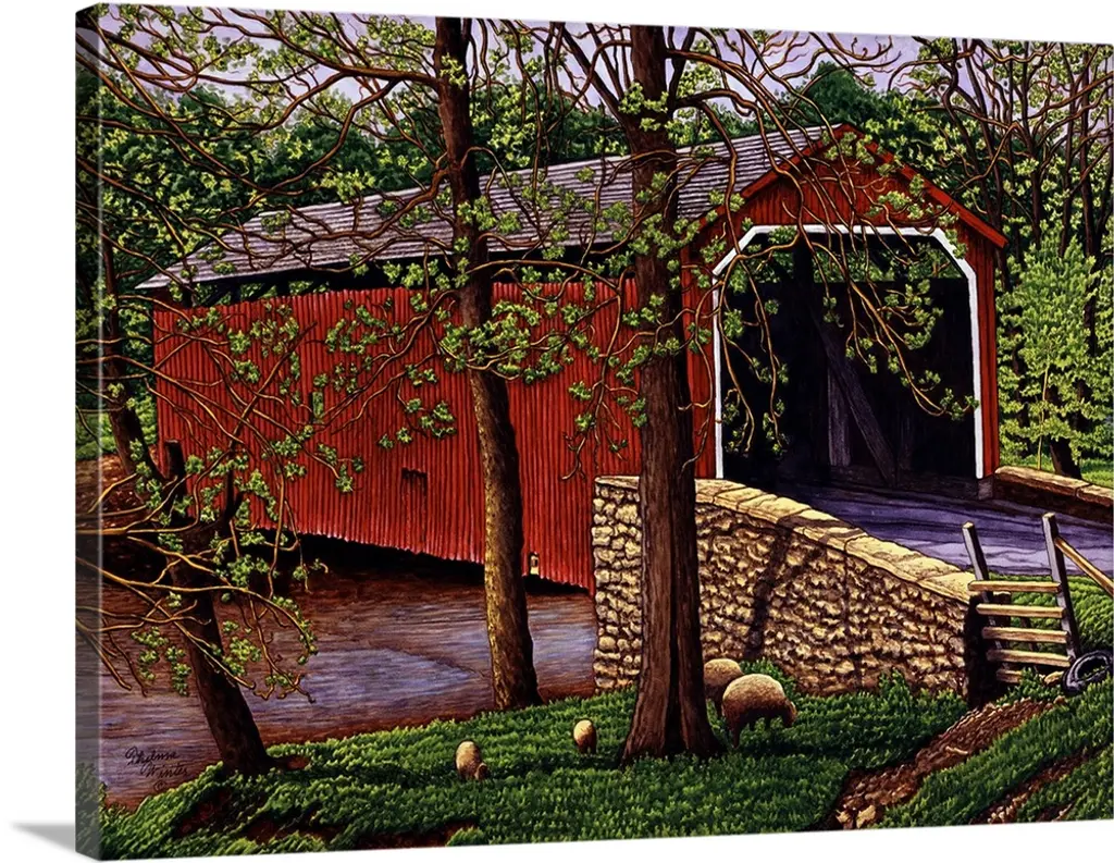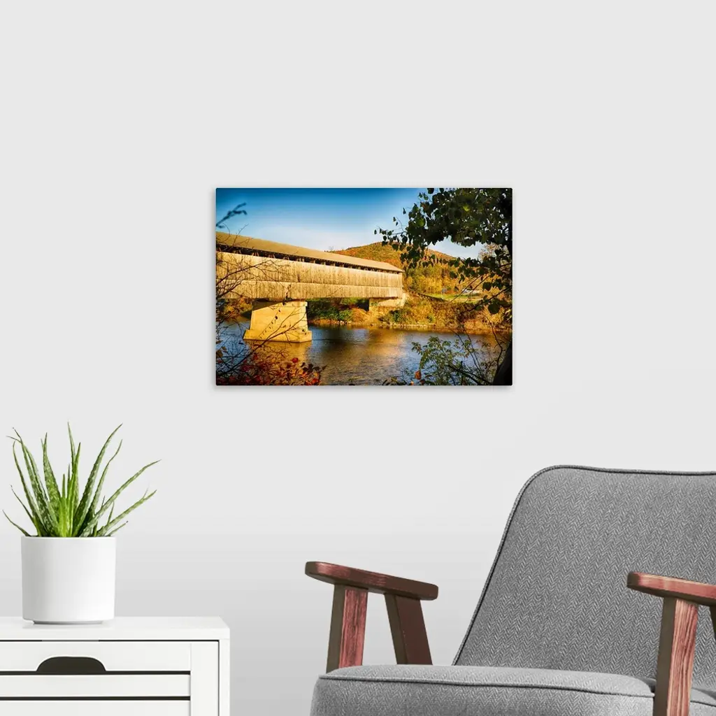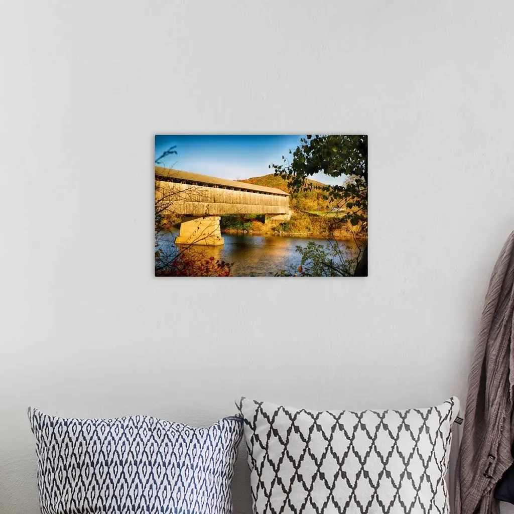 A covered bridge over the river in late afternoon sunlight, New Jersey.
