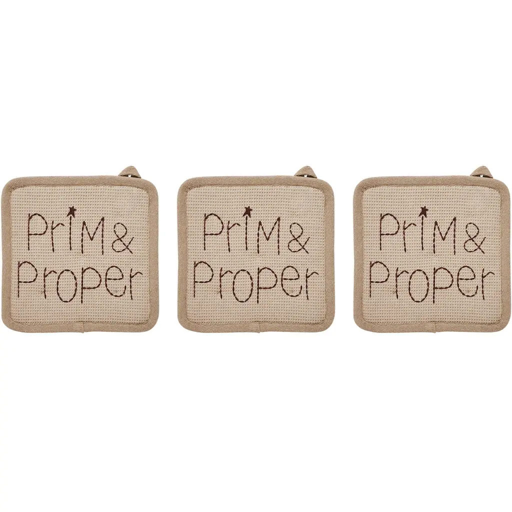 Enhance the charm of your kitchen with the VHC Brands Cotton Pot Holder Set of 3 from the Connell Collection, a delightful addition to your culinary decor. These square 8x8-inch pot holders feature a primitive design with a classic country feel, exuding warmth and character. Crafted from durable cotton with a waffle pattern printed with Prim & Proper, these pot holders offer both reliable heat resistance and a timeless appeal. The rich Burgundy and natural color of these pot holders adds a touch of rustic elegance, creating a welcoming atmosphere in your kitchen. Whether you're cooking up a storm or simply need to protect your hands from hot cookware, these pot holders provide a perfect blend of style and functionality. Their waffle-textured fabric enhances grip and heat resistance, making them a versatile choice for everyday use. The Connell Collection's pot holders offer a distinctive way to elevate your kitchen's decor while ensuring your safety in the kitchen. Their primitive design and waffle-textured cotton construction create a unique combination of style and practicality. These pot holders are the ideal choice for adding warmth and character to your home, making your kitchen a cozy and inviting space for all your culinary adventures.