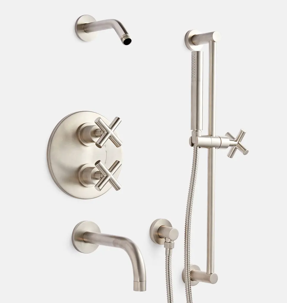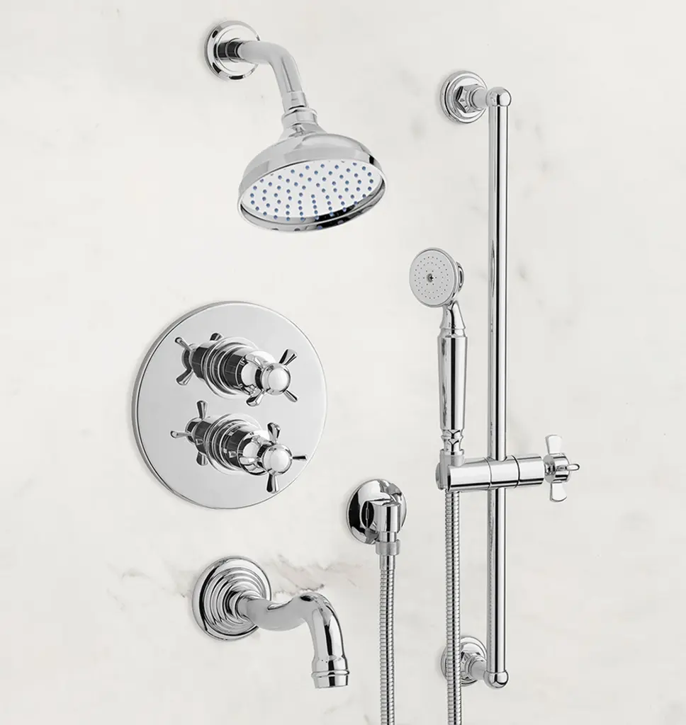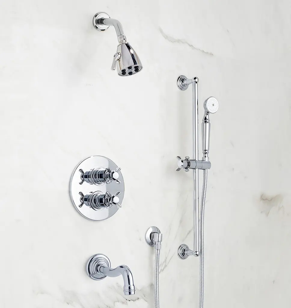 Inspired by traditional Victorian silhouettes and crafted in solid brass, Connor features an elegantly curved spout and cross handles with turned detailing. Thermostatic shower sets feature dual knobs that make it easy to adjust water temperature and pressure separately, offering superior water flow, consistent temperature, and increased energy efficiency. Complete your set with your choice of shower head to create the ideal bath experience.
