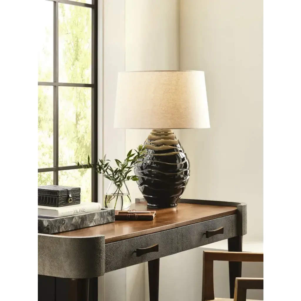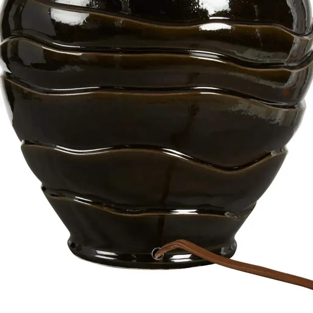 The Cono Lamp brings sculptural elegance to any setting with its striking silhouette and rich finish. Crafted from Italian ceramic, the base features a tiered, organic form glazed in a deep greenish brown that shimmers subtly under light. Topped with a warm linen shade, this lamp offers a sophisticated blend of texture and tone.