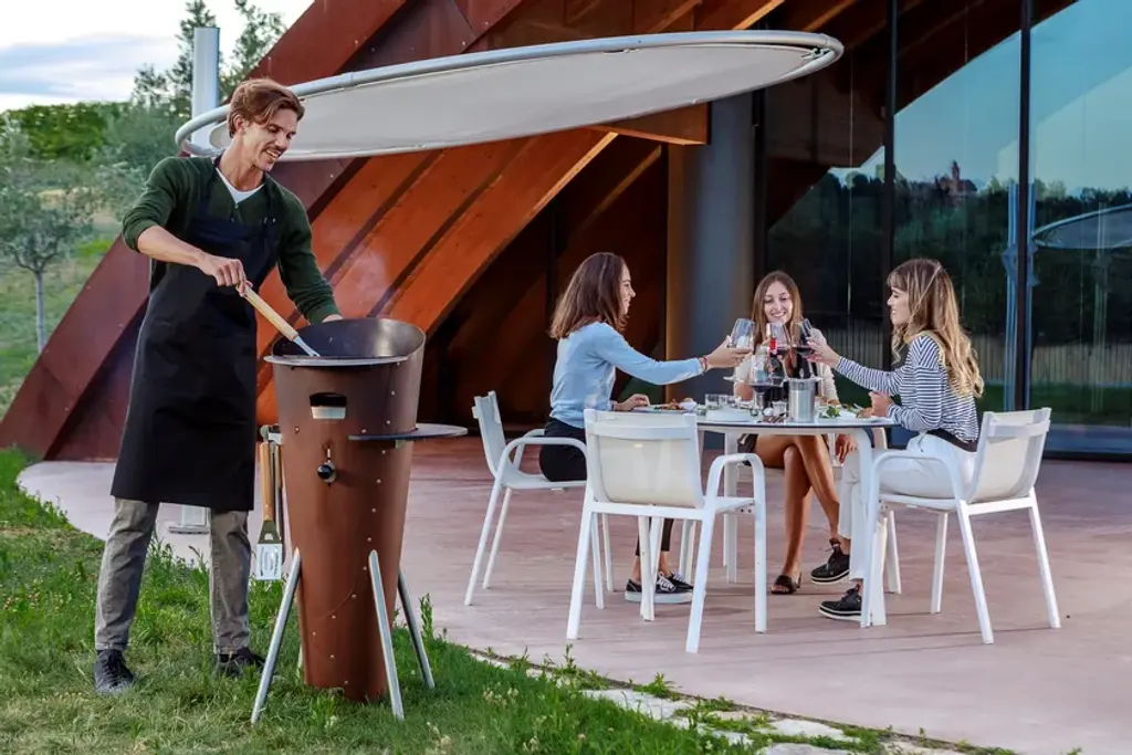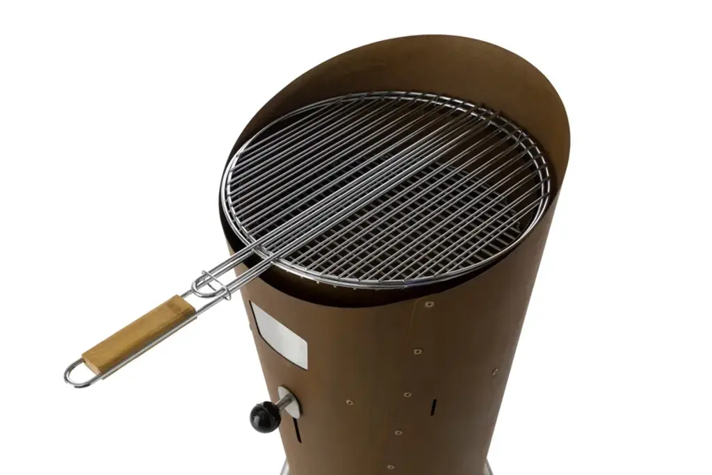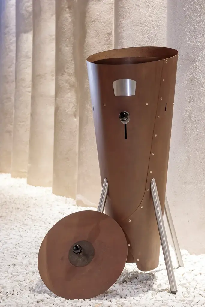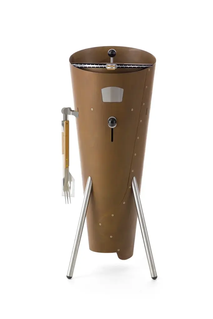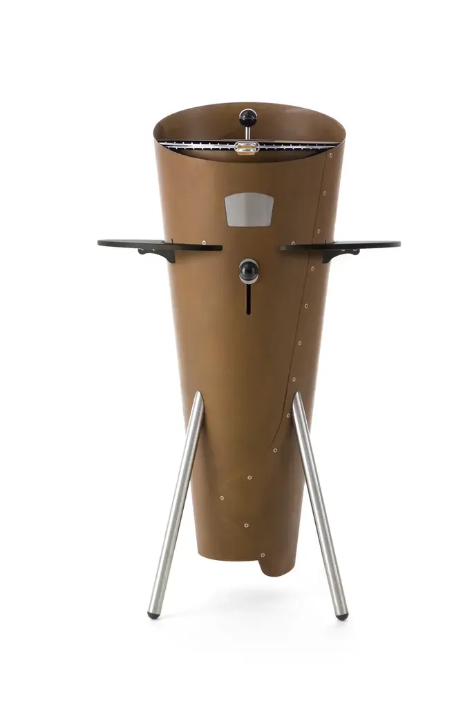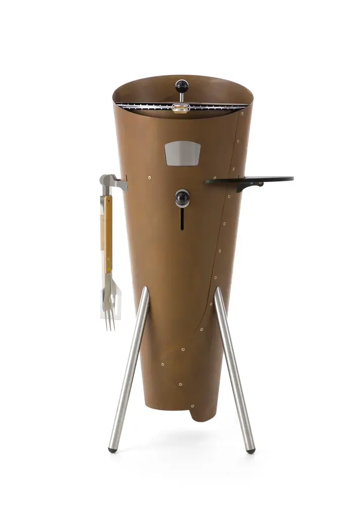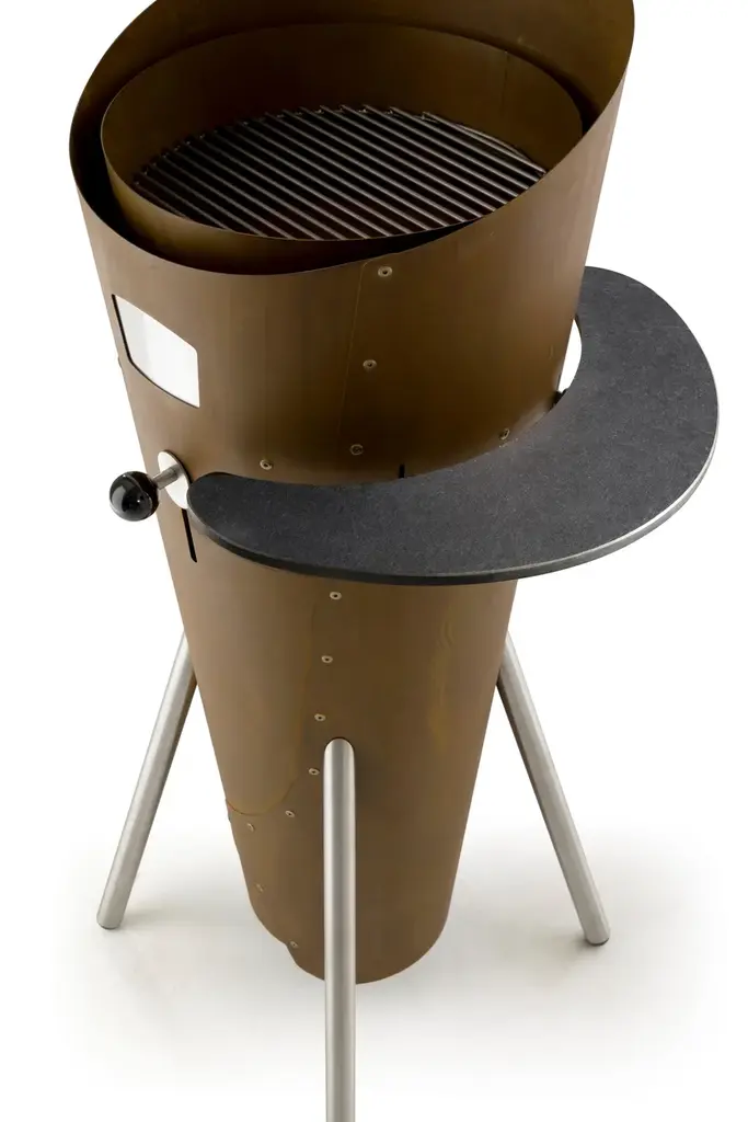 Conogrill is a wood or charcoal barbecue that combines aesthetics, choice of materials and functionality. Conogrill has a conical shape and is made from a single sheet of Cor-ten steel. It is equipped with a brazier that can be fed with wood or charcoal which distributes the heat evenly.Practical and elegant, Conogrill is ideal for those who love to cook outdoors or meet up with friends and relatives on cooler evenings. With its harmonious lines, the barbecue integrates optimally in different settings from the garden to the terrace. Thanks to its compact design, it takes up little space with the advantage of being able to be safely left outside all year round without the need to be stored in the winter. Its internal structure, designed for the drainage of water and the escape of fumes, provides stability and safety in all phases of use.ConceptA solid Cor-ten structure and stainless steel details give life to Conogrill, an object with an aesthetic and functional design, designed to offer a welcoming place to your outdoor space around which to cook and enjoy a scenic bonfire in company.A single steel plate that overlaps creates the characteristic conical shape, ensuring optimal air circulation and uniform heat distribution during the cooking phases of food. A stainless steel ventilation valve placed in the front will allow you to better manage the flame whether you want to use the wood-burning device for heating or with charcoal for grilling.Details- A Cor-ten steel lid equipped with a black bakelite knob protects the Conogrill cooking plate.- A double round grill with wooden handle will allow you to cook any element with extreme ease of use. - A stainless steel shelf to be applied to the front of the Conogrill barbecue allows you to have a practical support base for the grill during cooking.- A practical outdoor HPL table can be fixed to the main structure of the barbecue by means of a hooking system to obtain a useful support surface for spices and food.- A barbecue set made of stainless steel and with wood finishes, extremely heat resistant and expertly designed to have everything you need always at hand.