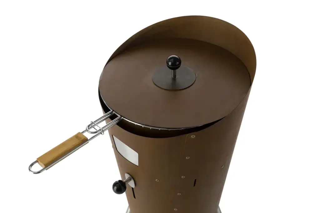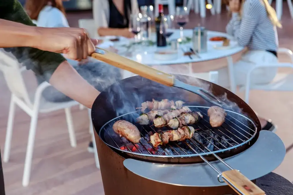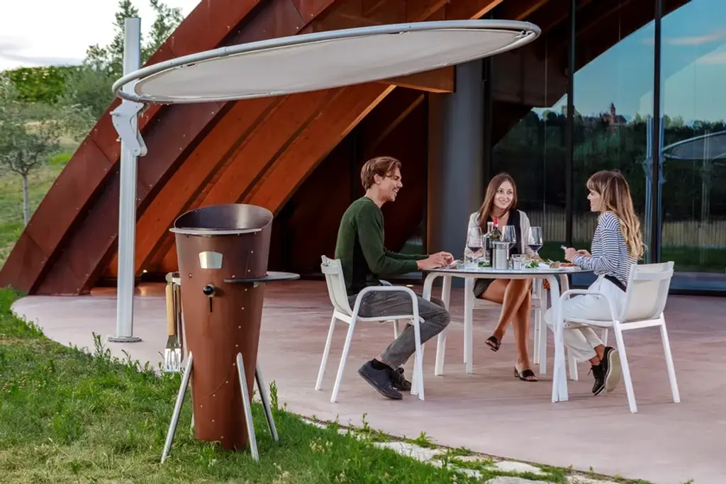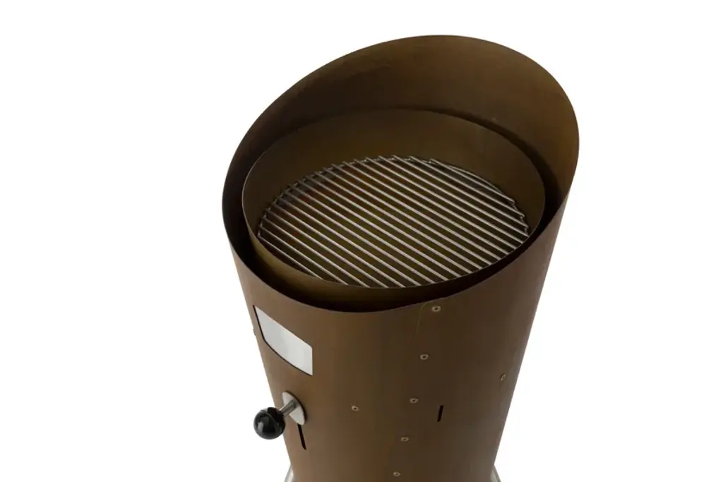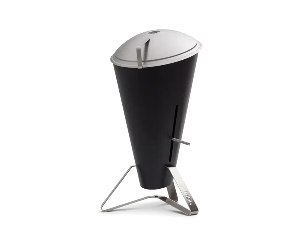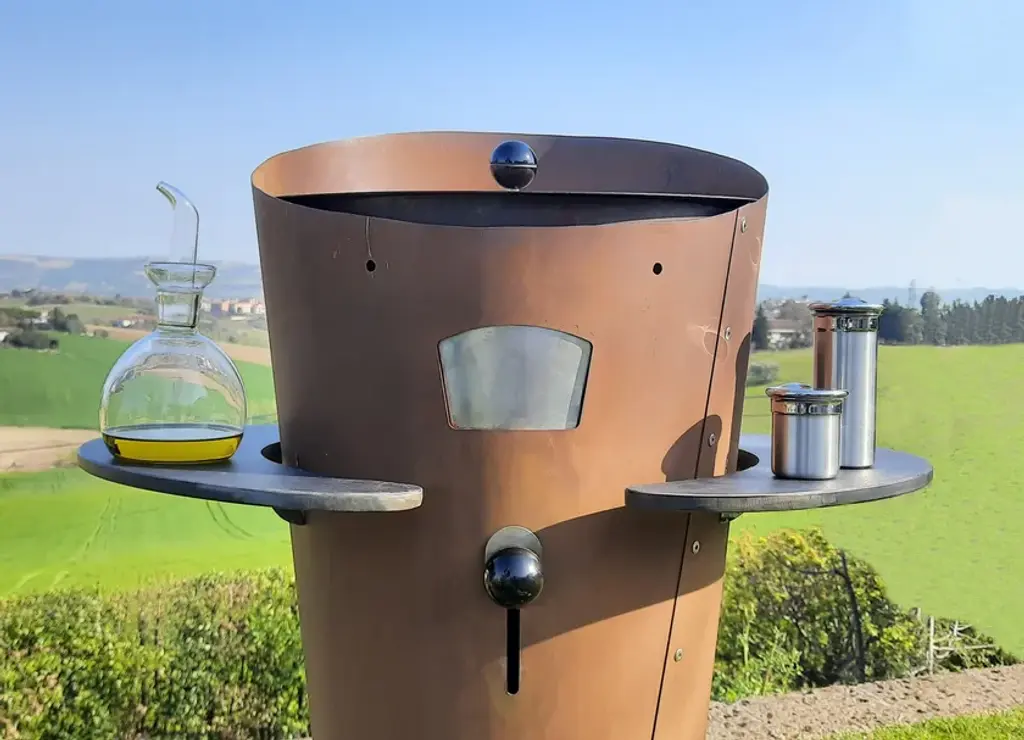 Conogrill is a wood or charcoal barbecue that combines aesthetics, choice of materials and functionality. Conogrill has a conical shape and is made from a single sheet of Cor-ten steel. It is equipped with a brazier that can be fed with wood or charcoal which distributes the heat evenly.Practical and elegant, Conogrill is ideal for those who love to cook outdoors or meet up with friends and relatives on cooler evenings. With its harmonious lines, the barbecue integrates optimally in different settings from the garden to the terrace. Thanks to its compact design, it takes up little space with the advantage of being able to be safely left outside all year round without the need to be stored in the winter. Its internal structure, designed for the drainage of water and the escape of fumes, provides stability and safety in all phases of use.ConceptA solid Cor-ten structure and stainless steel details give life to Conogrill, an object with an aesthetic and functional design, designed to offer a welcoming place to your outdoor space around which to cook and enjoy a scenic bonfire in company.A single steel plate that overlaps creates the characteristic conical shape, ensuring optimal air circulation and uniform heat distribution during the cooking phases of food. A stainless steel ventilation valve placed in the front will allow you to better manage the flame whether you want to use the wood-burning device for heating or with charcoal for grilling.Details- A Cor-ten steel lid equipped with a black bakelite knob protects the Conogrill cooking plate.- A double round grill with wooden handle will allow you to cook any element with extreme ease of use. - A stainless steel shelf to be applied to the front of the Conogrill barbecue allows you to have a practical support base for the grill during cooking.- A practical outdoor HPL table can be fixed to the main structure of the barbecue by means of a hooking system to obtain a useful support surface for spices and food.- A barbecue set made of stainless steel and with wood finishes, extremely heat resistant and expertly designed to have everything you need always at hand.
