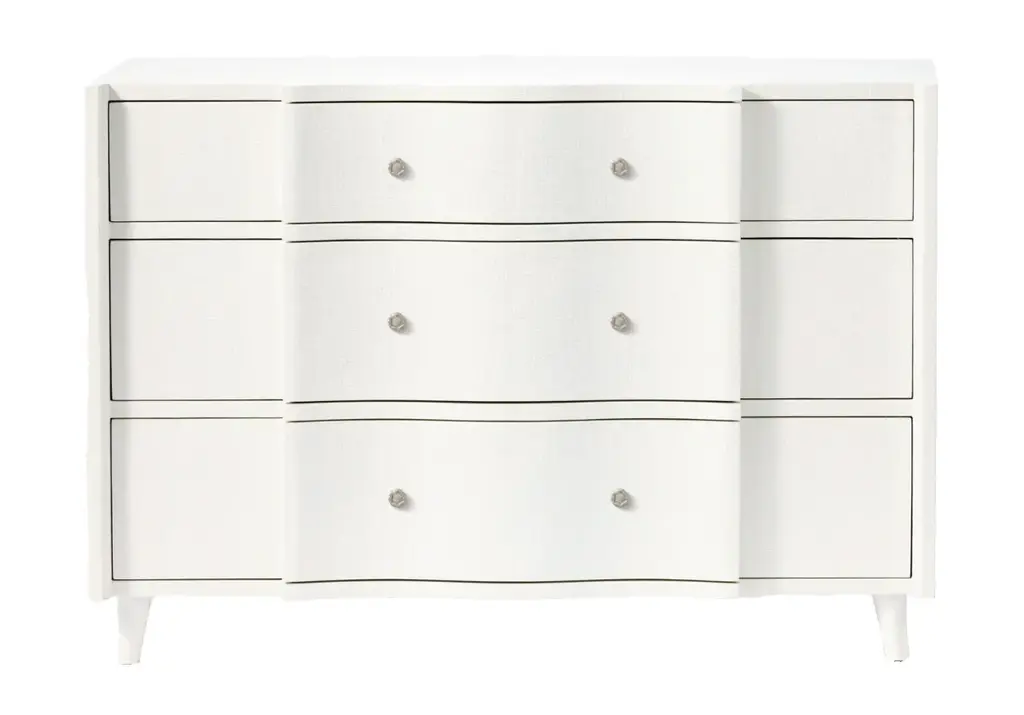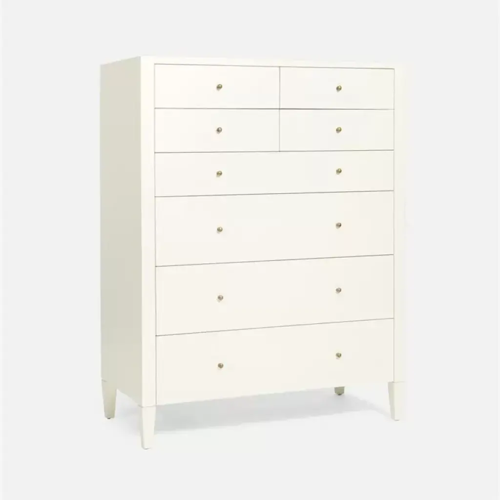 Our Conrad combines design with functionality. The new tallboy is covered in glamorous faux raffia and has eight wood-linen drawers offering ample storage.
