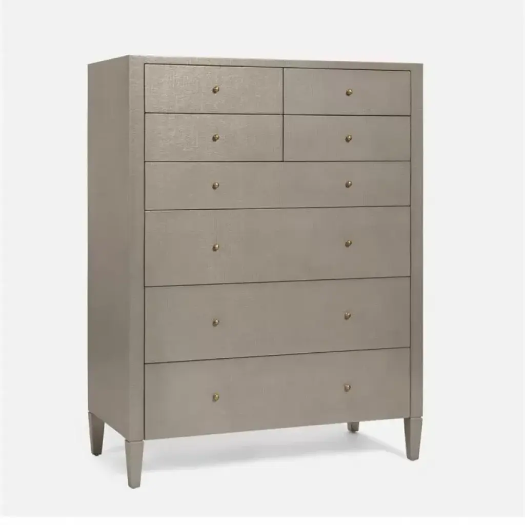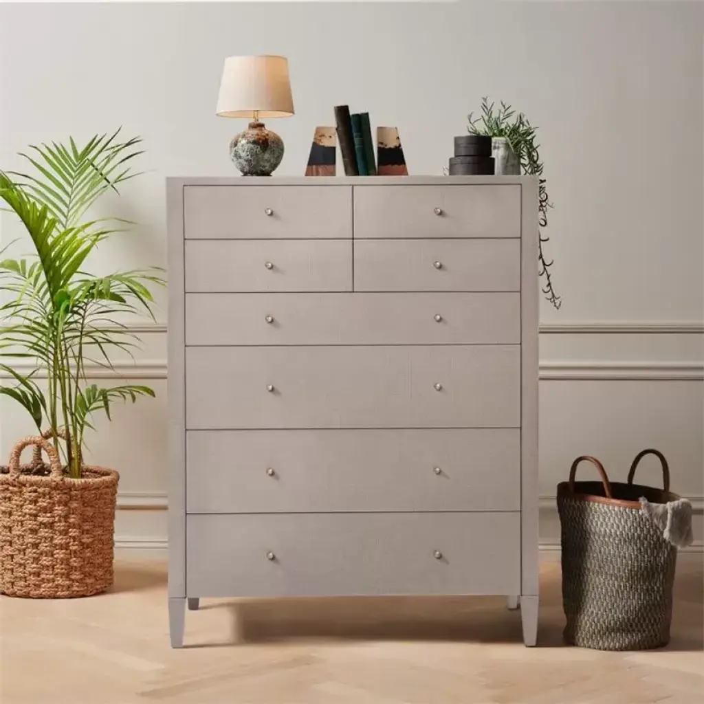 Our Conrad combines design with functionality. The new tallboy is covered in glamorous faux raffia and has eight wood-linen drawers offering ample storage.