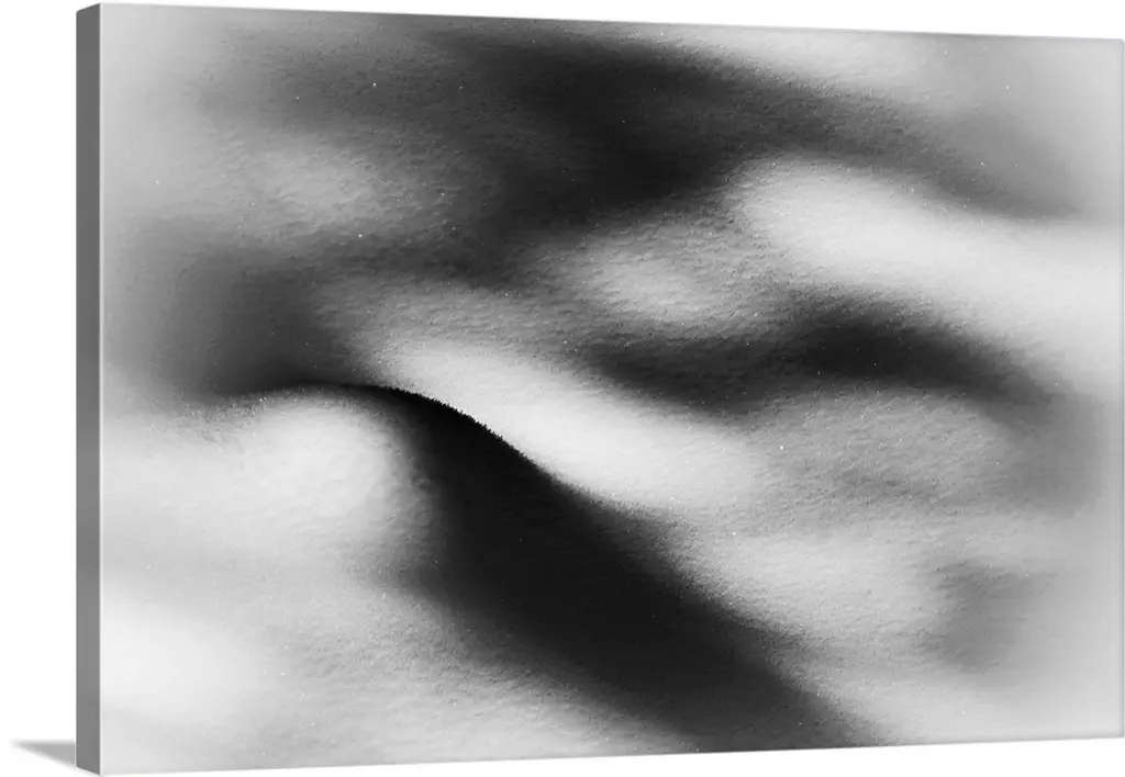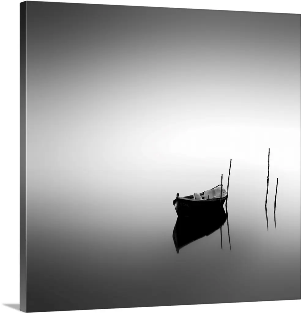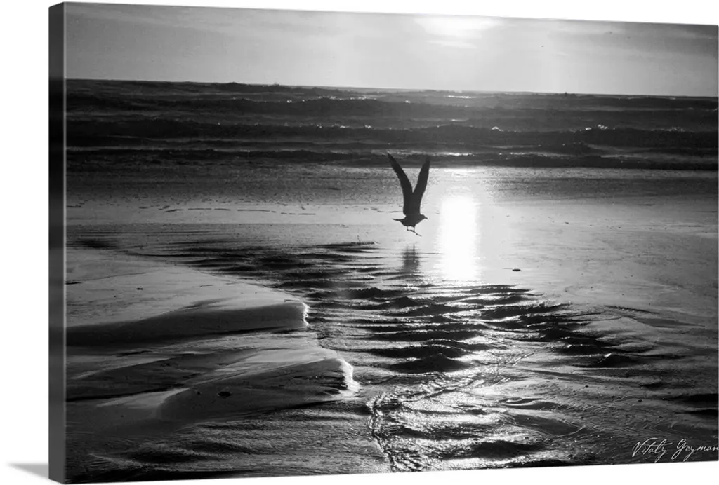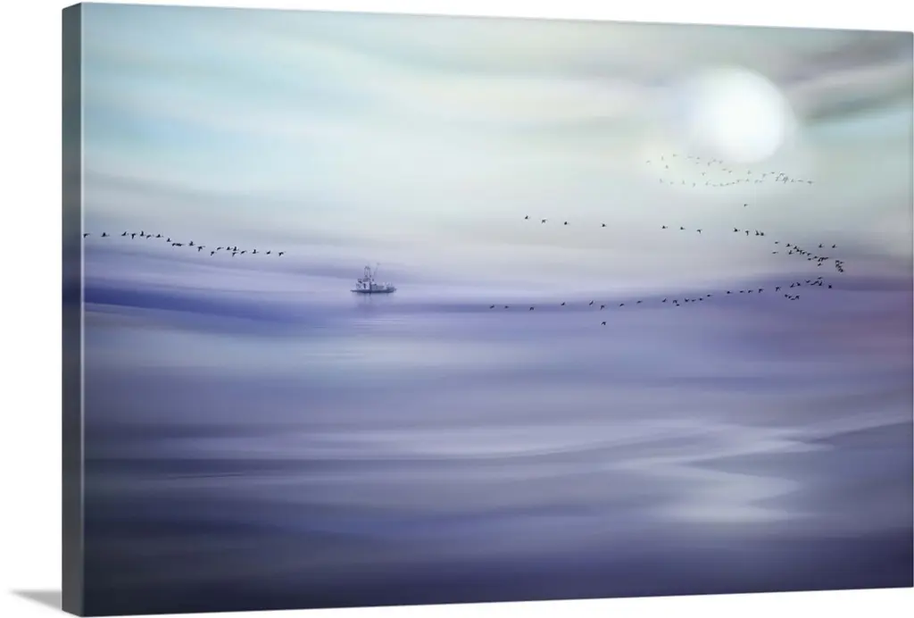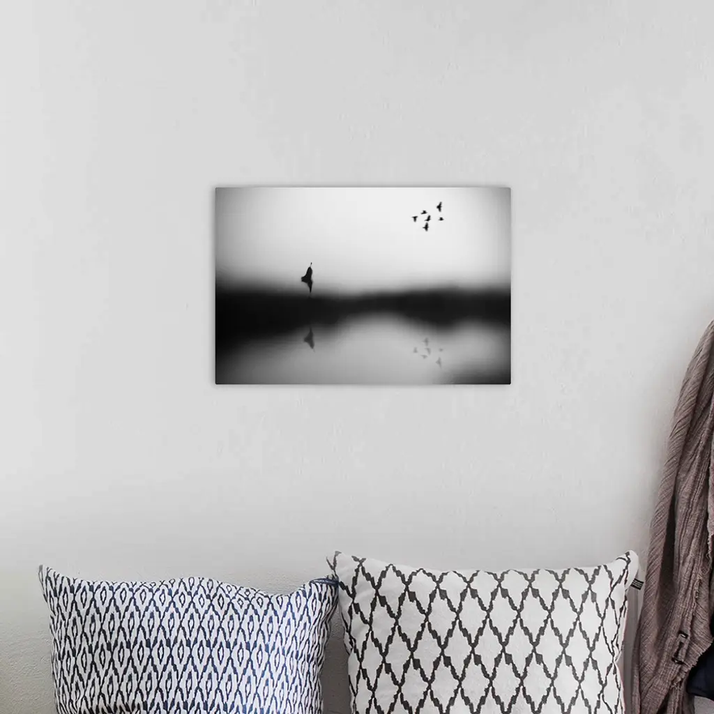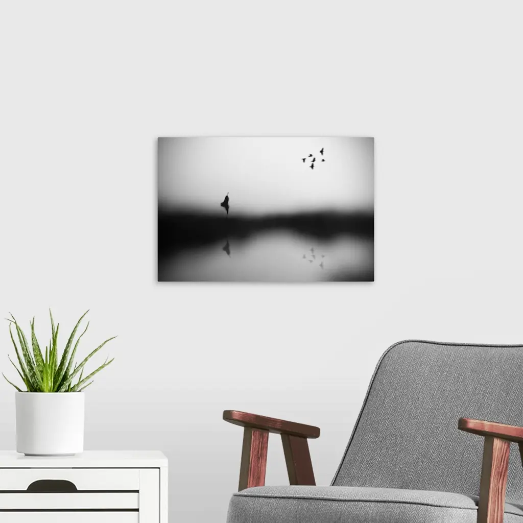 Out of focus image of a figure walking by water with a small flock of birds overhead.