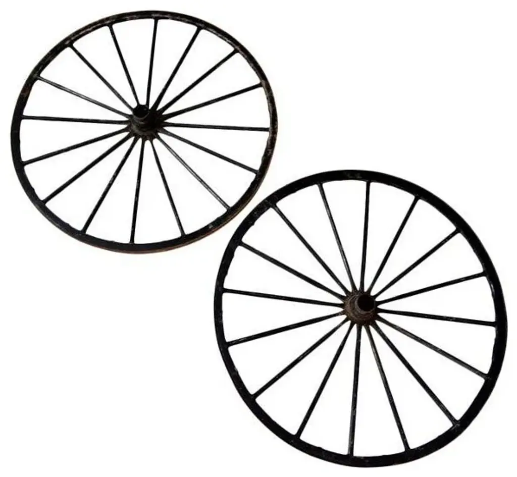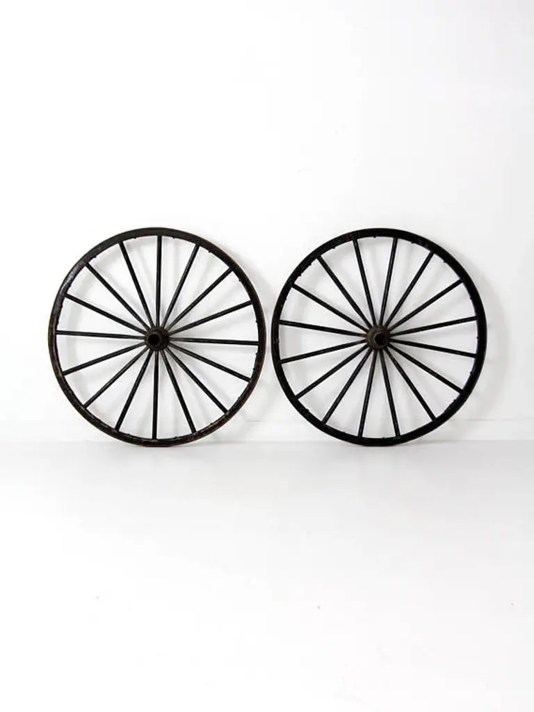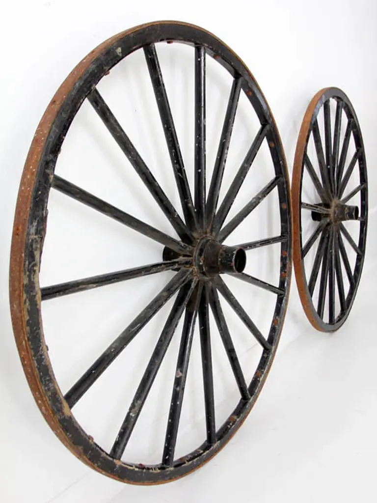 This is a pair of antique wagon wheels. The two wooden spoke wheels are black with metal hubs, bearings, and flat steel tires. pre-1990''s2 wheelsblack wagon wheelswood with metalorigin: United StatesCONDITIONIn good condition with wear consistent with age and use. MEASUREMENTSDiameter: 41.5"-105.4 cmDepth: 8.25"-21 cm