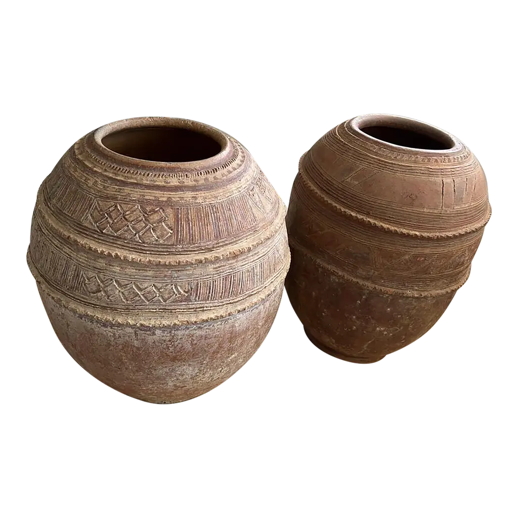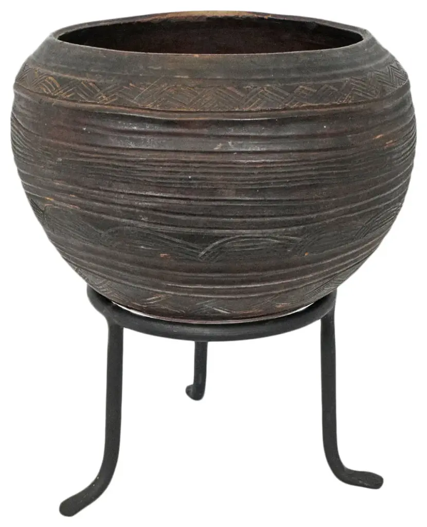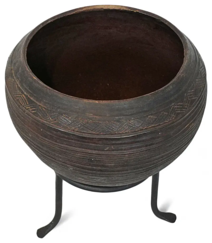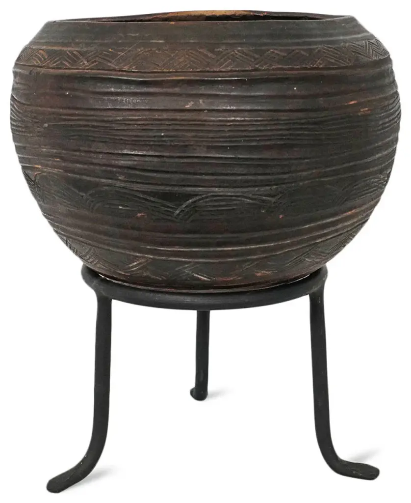 Consigned beautiful vintage Bida water vessel on iron stand. Hand crafted old terra cotta water storage pot with hand carved design patterns. Each is unique in details with signs of age and use. Rounded bottom sits in black iron three leg display stand. Opening at top is 9" diameter. Condition: Great, with signs of age and useOrigin: NigeriaEra: Mid 1900''s