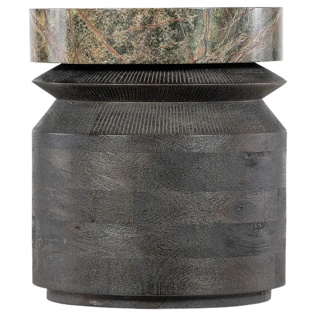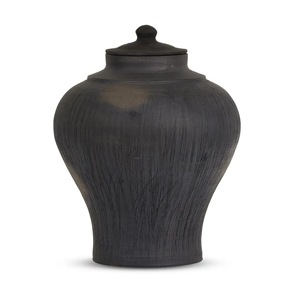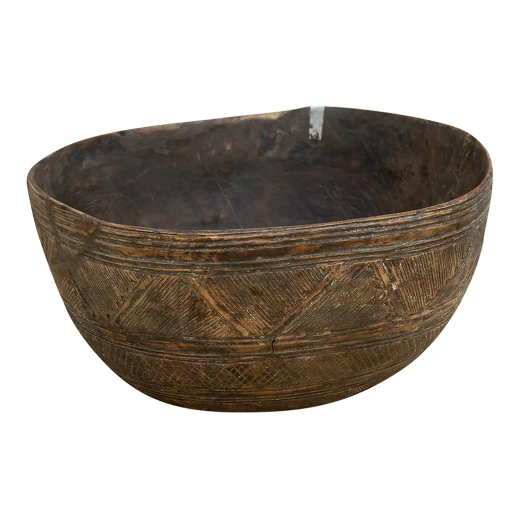 Consigned beautiful vintage Bida water vessel on iron stand. Hand crafted old terra cotta water storage pot with hand carved design patterns. Each is unique in details with signs of age and use. Rounded bottom sits in black iron three leg display stand. Opening at top is 9" diameter. Condition: Great, with signs of age and useOrigin: NigeriaEra: Mid 1900''s