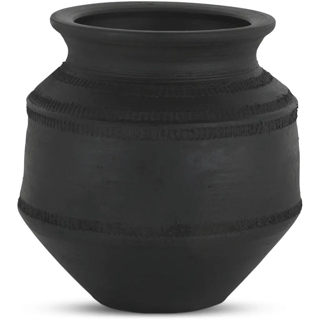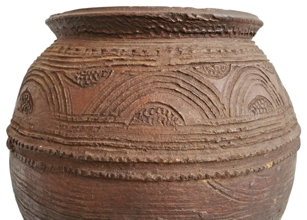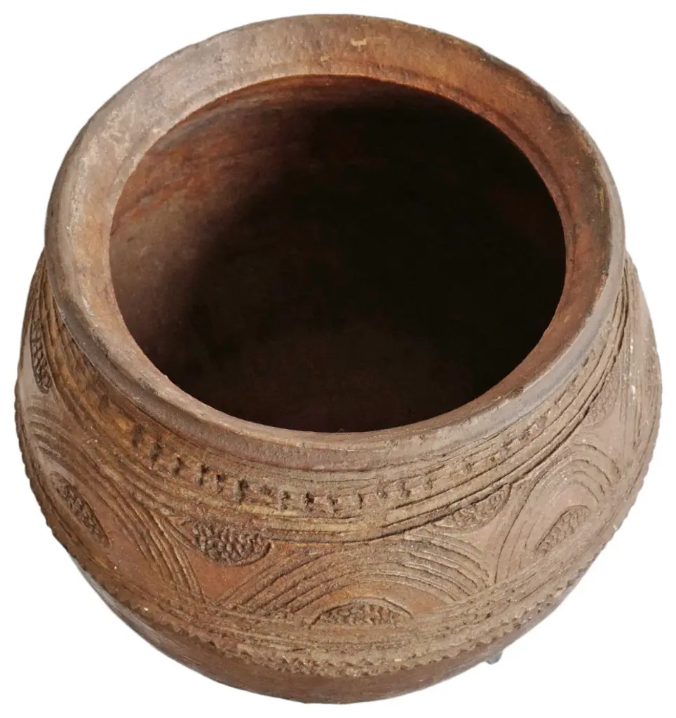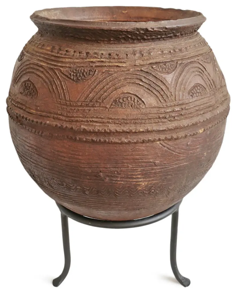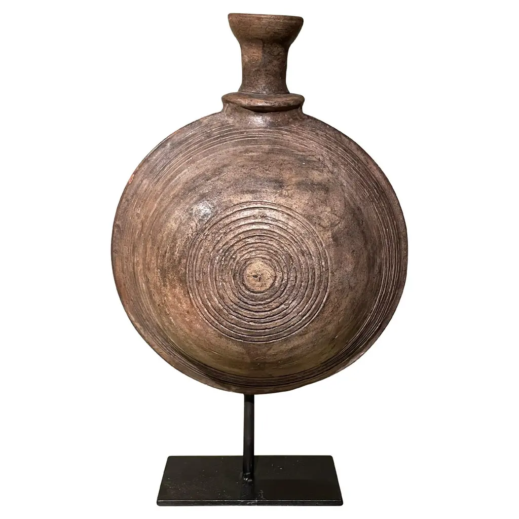 Consigned beautiful vintage Bida water vessel on iron stand. Hand crafted old ceramic / terra cotta water storage pot with hand carved design patterns. Each is unique in details with signs of age and use. Rounded bottom sits in black iron three leg display stand. Opening at top is 8.5" diameter.Condition: Great, with signs of age and useOrigin: NigeriaEra: Mid 1900''s