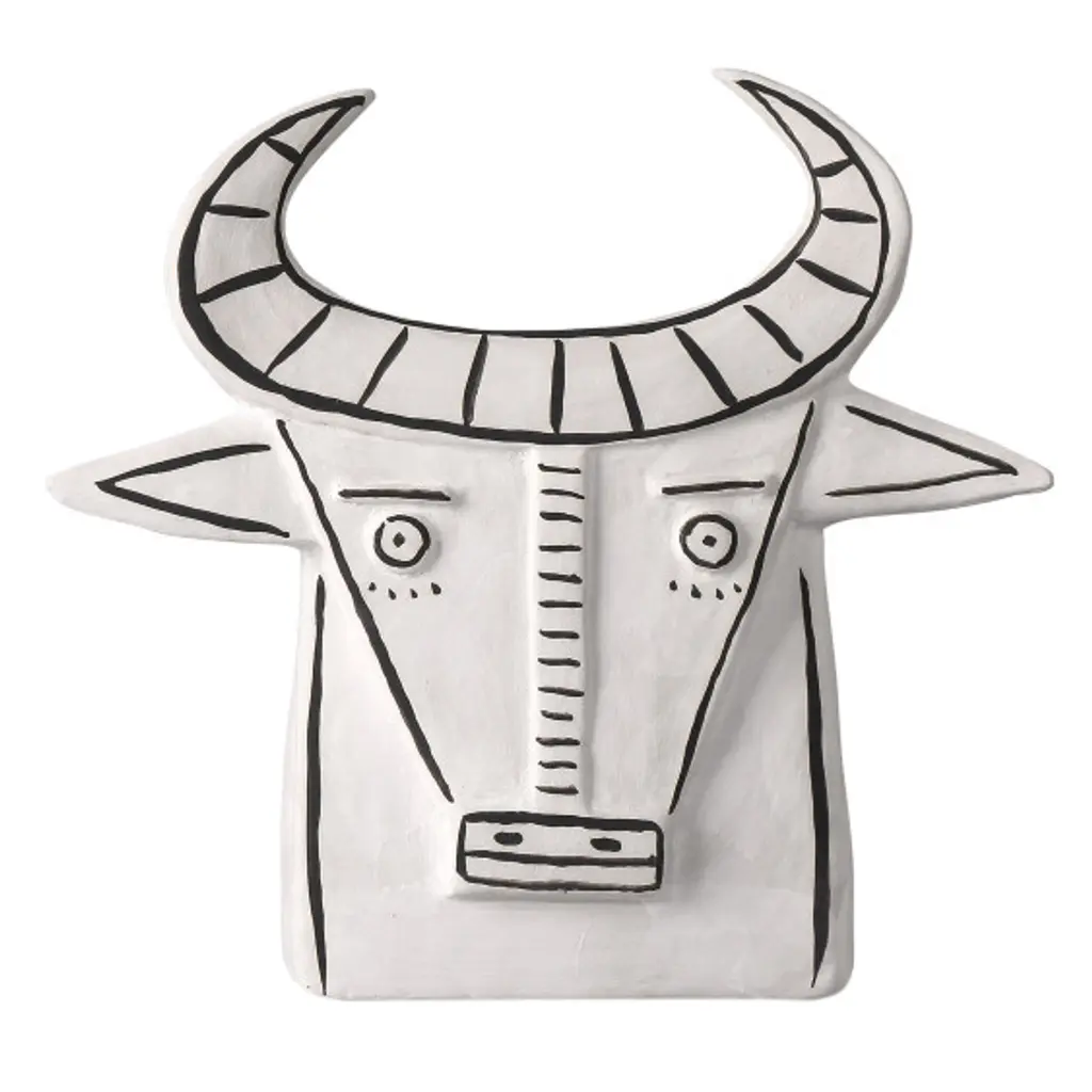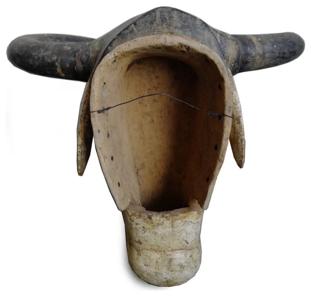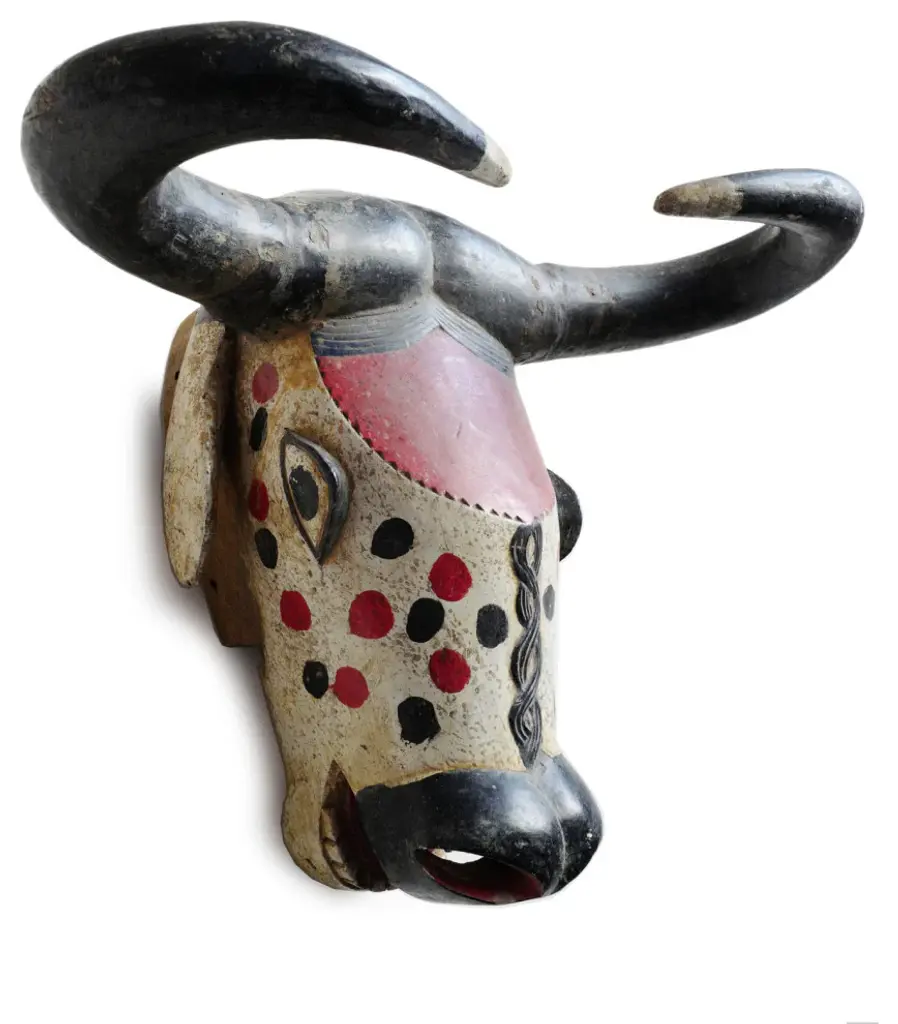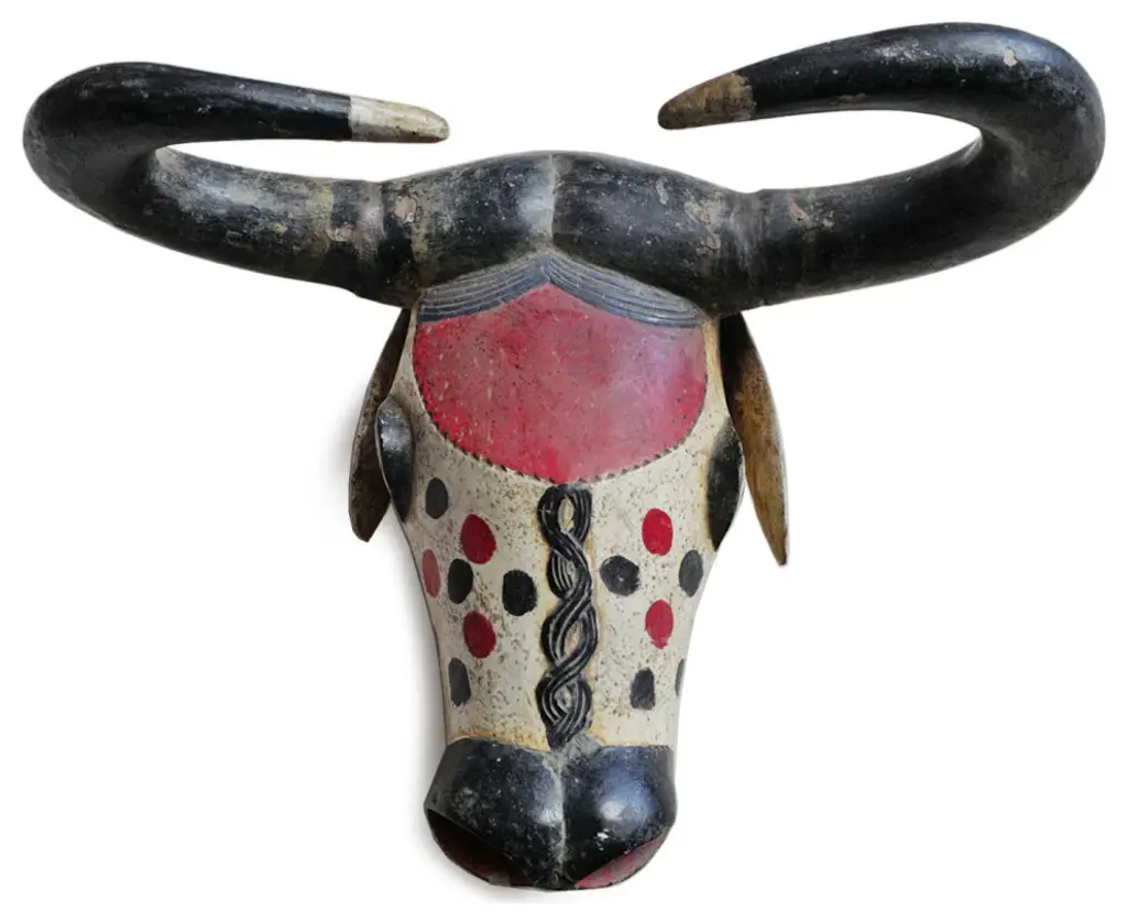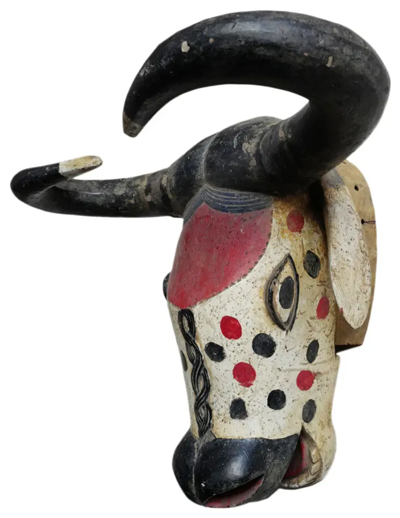 Consigned original cow mask from the Bidjogo people of Guinea. Hand painted pigments with striking black, red, and white dots. Worn on the top of the head durning various ceremonies with raffia and or cloth skirting. Impressive collectors piece ready to hang.Condition: Great, with signs of age and useOrigin: GuineaEra: 1900''s