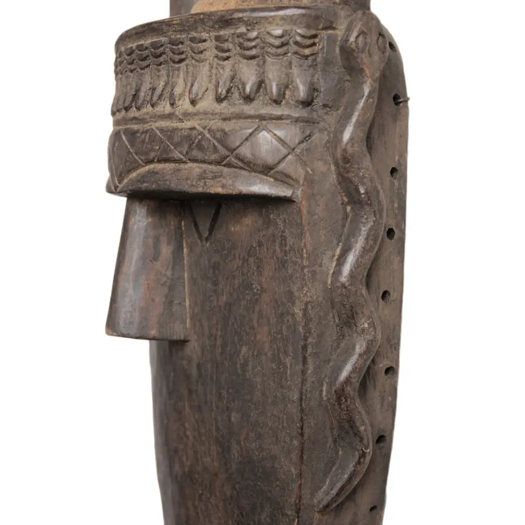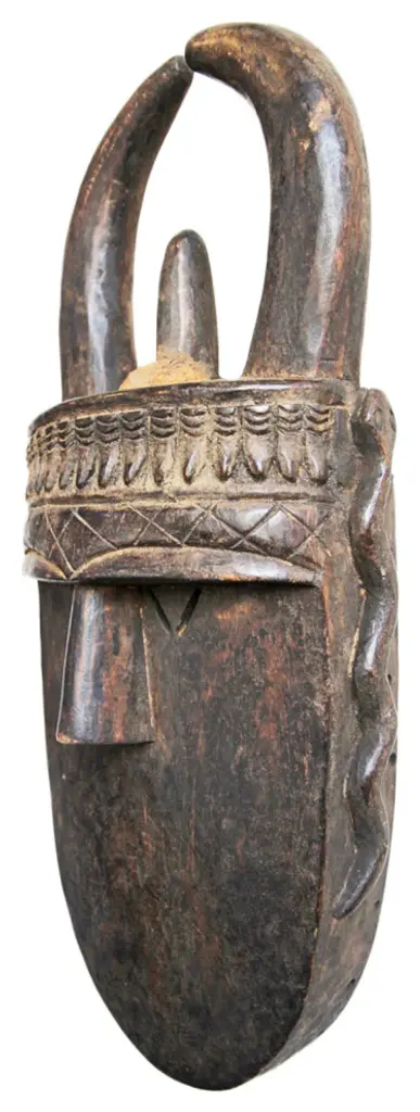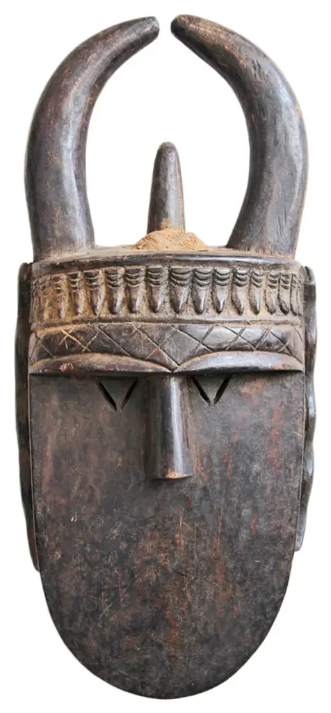 Consigned authentic Toma wood carved tribal mask from Guinea. Beautiful hand carved details and patterns. Horns curving inward at top. Rich patina with signs of age and use.Condition: Great, with signs of age and useOrigin: GuineaEra: Mid 1900''s