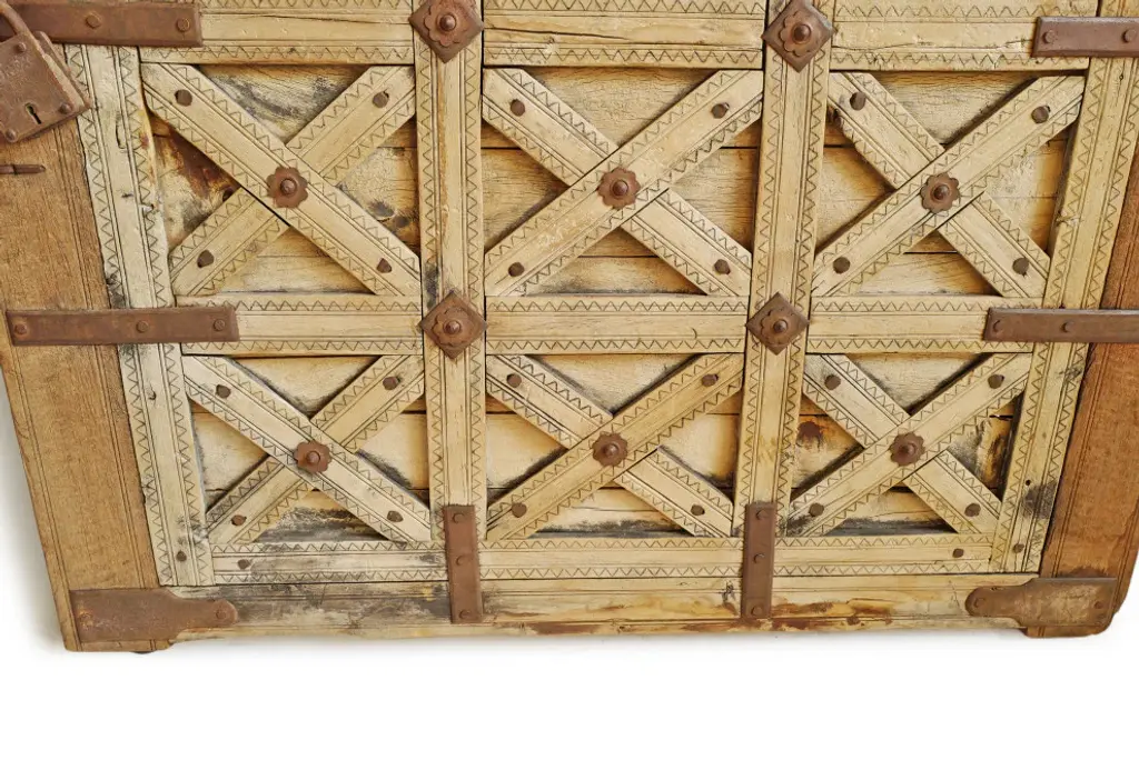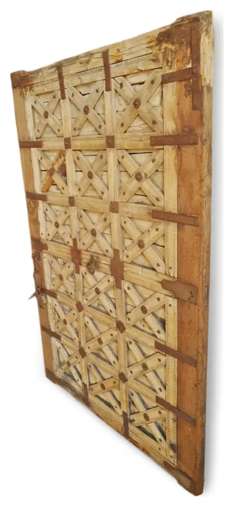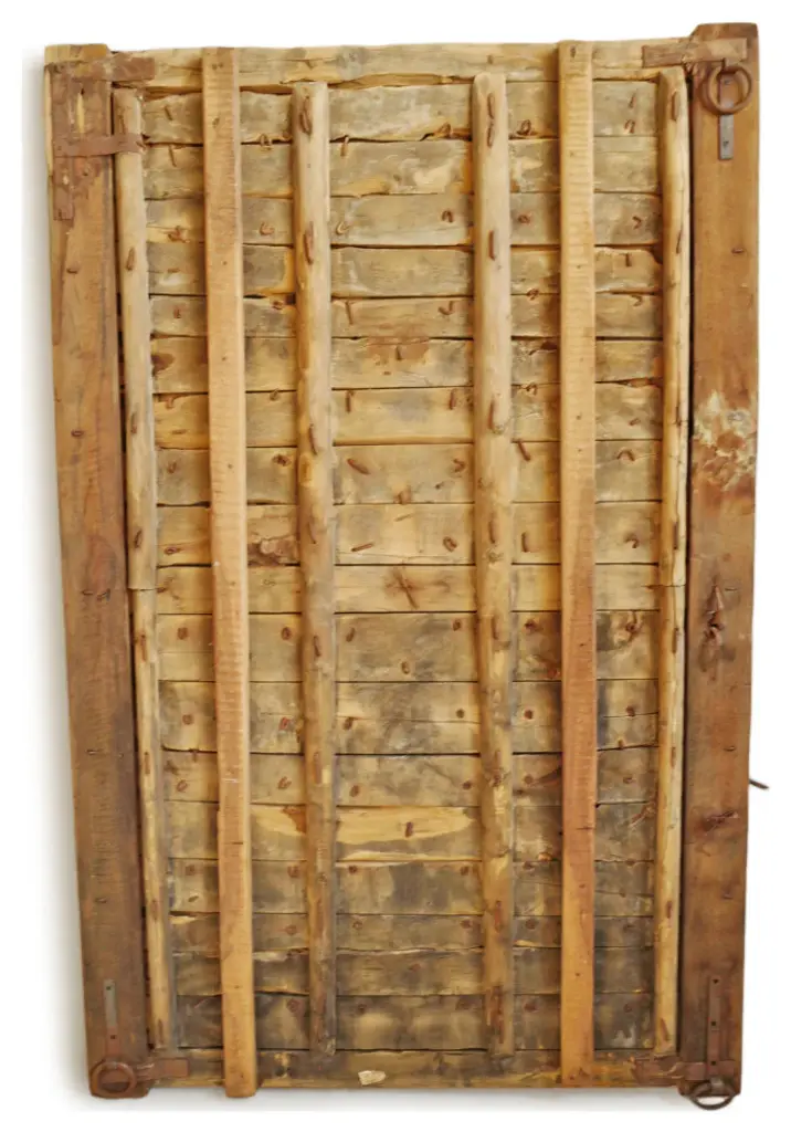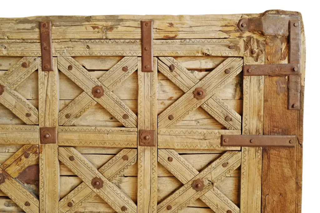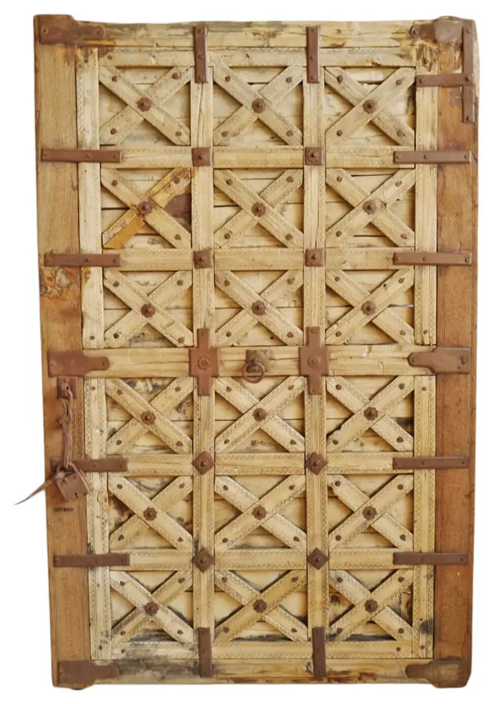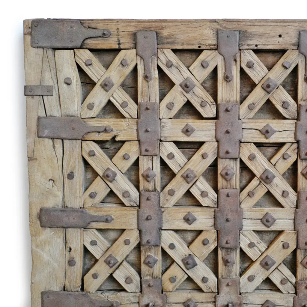 Consigned vintage teak wood and iron door panel from North India. Great for indoor or outdoor use or display. Natural finish on teak and aged rust finish on iron. When left exposed to outdoor elements, teak will naturally weather into a more silver/grey patina over time. Can be used as unique wall art or can be made into functional door by your personal contractor. Perfect for a rustic, farmhouse, industrial, or Asian style space.Condition: Great, with signs of age and useOrigin: IndiaEra: Mid 1900''s